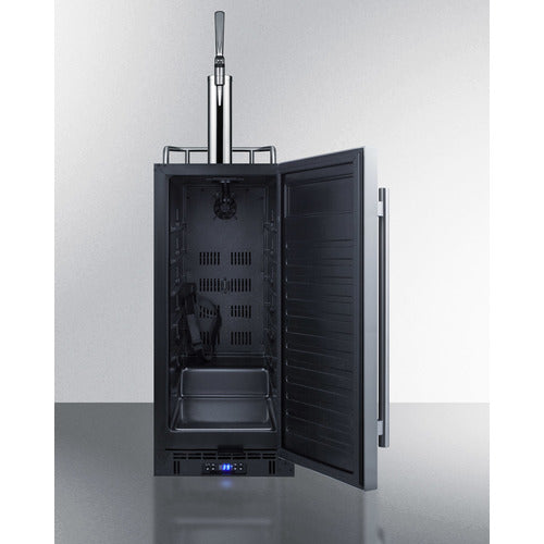 Summit offers a complete line of built-in kegerators/nitro coffee dispensers designed for use in commercial establishments. The SBC15NCF features a versatile design that meets NSF-7 and UL-471 commercial standards but is also approved for residential applications. Sized at 15" wide, it features a front-breathing design for built-in installation under counters and a fully finished cabinet for freestanding use. A stainless steel door and black cabinet finish afford added elegance to any setting, while the stainless steel handle completes the look. The sealed back allows for easy cleaning of the unit. Additional features include a removable two-piece stainless steel drip tray to collect spills and a chrome guard rail to help keep glasses and mugs in place. The user-reversible door swing makes it easy to accommodate any locationâs setup and four included casters (two are locking) make movement of the unit easy. A factory-installed lock provides added security. Inside, the 2.9 cu. ft. interior can hold a 1/6 (sixtel) nitro coffee keg. Two chrome shelves, with six placement options, allow the kegerator to also function as a beverage refrigerator. A digital thermostat makes it easy to manage the temperature, while the external digital display has a readout in Celsius or Fahrenheit. Automatic defrost operation ensures minimal user maintenance. We include a commercially approved tap kit that includes everything you need to serve nitro coffee, including a stainless steel stout style draft tower, regulator, and Nitrogen tank. A tap cool system keeps your coffee cold as it goes through your tower, and a Velcro strap holds the Nitro tank in place. A stainless steel floor plate provides added protection when placing and removing kegs. For a similar unit designed to serve flat cold brew coffee, see the SBC15CF. You can also create your own custom cold brew kegerator by combining any of our "NK" beer dispensers with our selection of cold brew tap kits. Note: Due to its door design, the SBC15NCF requires an additional 1/4" of width for the door to open to a full 90Âș. If placing this unit against a right angle wall, be sure to accommodate this extra space.
