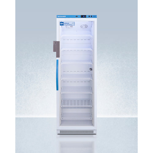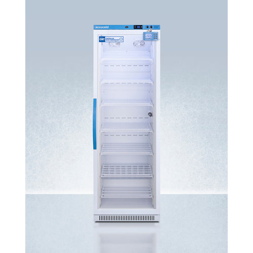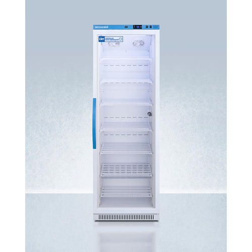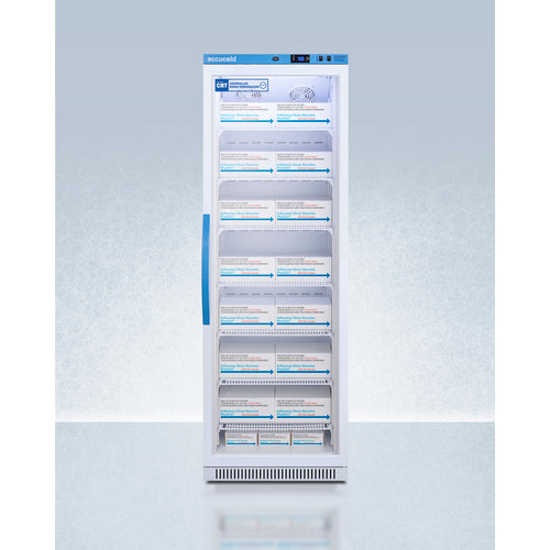 Accucold's Performance Series Controlled Room Temperature Cabinets offer purpose-built storage solutions for medication requiring a stable room temperature environment. The ARG15PV-CRT is a 15 cu.ft. upright unit pre-set to 72ºF, with an adjustable range from 68º to 77ºF. The microprocessor temperature controller is externally located to minimize door openings, helping to protect stored contents from ambient temperature. The buffered temperature probe is encased in a glycol-filled bottle to better simulate temperature of the stored product, with an additional sensor that reads air temperature to ensure superior temperature control. The current and min/max temperature display is viewable in Celsius or Fahrenheit to the nearest tenth of a degree. The audible and visual temperature alarm sounds if the unit's interior goes out of range. Additional alarms include a power failure alert, door open alarm, and sensor failure alarm. This unit is equipped with remote alarm contacts in the rear and a 1/2" probe port on the right side to accept additional monitoring devices. A hospital grade cord with 'green dot' plug is also included for added safety in high traffic areas. Inside, the ARG15PV-CRT utilizes adjustable cycle defrost operation to avoid temperature spikes. Optimized forced air cooling with two internal fans ensures excellent temperature stability and uniformity with rapid recovery after door openings. The adjustable plastic-coated wire shelves can be positioned at 1/2" increments to accommodate virtually any sized item. We include seven shelves, more than competitor products providing to maximize interior shelving storage area. This unit includes LED internal lighting with an on/off rocker switch. The interior is constructed from white powder coated metal to ensure added durability and better temperature retention. The ARG15PV-CRT comes in a white cabinet finish with a blue accented control panel. The factory-installed antimicrobial handle is powder-coated with naturally occurring silver ions, which help to reduce the spread of germs, allowing for a safer, cleaner user experience. The double pane tempered glass door provides a full view of the interior. The user-reversible door ships with a right hand swing and self-closing function. This model includes a factory-installed lock and ships with two keys for staff use. Powerful magnetic gaskets ensure a positive seal. Designed with hydrocarbon refrigerant, the ARG15PV-CRT provides an energy efficient solution to stabilized room temperature storage, even when ambient temperatures can reach temperatures as cold as 68ºF or warm as 86ºF. This unit is Pyxis, Omnicell, and AcuDose RX compatible. Additional sizes, as well as solid door options, are also available.