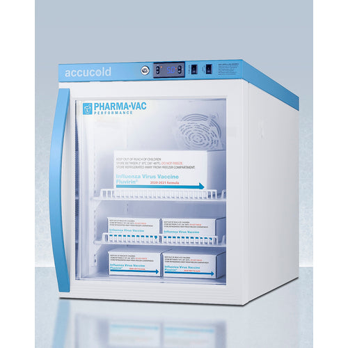 Accucold is proud to lead the industry with the largest line of cold storage product sizes certified to NSF/ANSI 456 Vaccine Storage Standard. The Pharma-Vac Performance Series supports meeting regulations and guidelines from the CDC, State Agencies, World Health Organization, and other Health Ministries on vaccine storage and handling. The ARG2PV456 is a 1.94 cu.ft. all-refrigerator with an adjustable control range from +2 to +8ÂșC. The microprocessor temperature controller is externally located to minimize door openings, helping to protect stored contents from ambient temperature. The buffered temperature probe is encased in a glycol-filled bottle to better simulate temperature of the stored product, with an additional sensor that reads air temperature to ensure superior temperature control. The current and min/max temperature display is viewable in Celsius or Fahrenheit to the nearest tenth of a degree. The audible and visual temperature alarm sounds if the unit's interior goes out of range. Additional alarms include a power failure alert, door open alarm, and sensor failure alarm. This unit is equipped with remote alarm contacts in the rear and a 1/2" probe port on the right side to accept additional monitoring devices. A hospital grade cord with 'green dot' plug is also included for added safety in high traffic areas. Inside, the ARG2PV456 utilizes adjustable cycle defrost operation to avoid temperature spikes. Optimized forced air cooling with an internal fan to ensure excellent temperature stability and uniformity with rapid recovery after door openings. The adjustable plastic-coated wire shelves can be positioned at 1/2" increments to accommodate virtually any sized item. This unit includes LED internal lighting with an on/off rocker switch. The interior is constructed from white powder coated metal to ensure added durability and better temperature retention. The ARG2PV456 comes in a white cabinet finish with a blue accented control panel. The factory-installed antimicrobial handle is powder-coated with naturally occurring silver ions, which help to reduce the spread of germs, allowing for a safer, cleaner user experience. The double pane tempered glass door provides a full view of the interior. The door ships with a right hand swing and self-closing function. This model includes a factory-installed lock and ships with two keys for staff use. Powerful magnetic gaskets ensure a positive seal. Designed with hydrocarbon refrigerant, the ARG2PV456 provides an energy efficient solution to vaccine storage. This unit is Pyxis, Omnicell, and AcuDose RX compatible. Additional sizes, as well as solid door options, are also available. Explore the full Pharma-Vac NSF 456 series at accucold.com/pharmavac. ABOUT NSF 456: NSF/ANSI 456 is a voluntary standard introduced in 2021 that was designed to establish the performance and construction requirements for vaccine refrigeration. Models certified to this standard undergo strict testing to confirm temperatury consistency. All Accucold units approved to NSF 456 for vaccine storage are certified by an independent testing agency.
