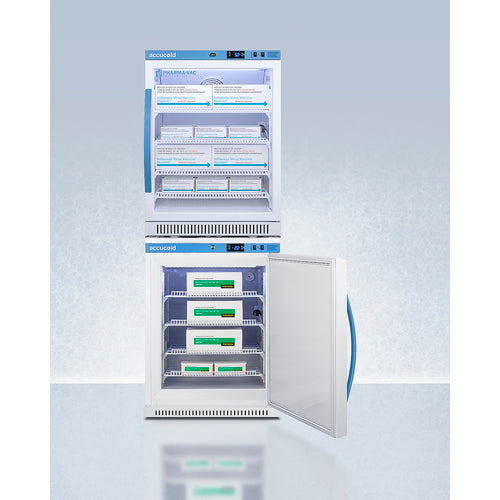 Accucold offers innovative solutions to vaccine storage with our Performance Series stackable purpose-built refrigerator-freezer combinations designed to support meeting CDC/VFC/VFA guidelines. Sized just under 24" wide, the ARG6PV-AFZ5PVBIADASTACK combines the 6 cu.ft. ARG6PV auto defrost all-refrigerator with AFZ5PVBIADA all-freezer into one slim footprint using Accucold's StackRack. This ships in three boxes and requires some minor assembly upon delivery. The Pharma-Vac Performance Series is designed to meet the demanding needs of vaccine storage. Both units utilize a microprocessor temperature controller (refrigerator range: +2 to +8ÂșC; freezer range: -30 to -10ÂșC). The buffered temperature probe is encased in a glycol-filled bottle to better simulate temperature of the stored product, with an additional sensor that reads air temperature to ensure superior temperature control. The current and min/max temperature display is viewable in Celsius or Fahrenheit to the nearest tenth of a degree. The audible and visual temperature alarms sound if the units' interiors go out of range. Additional alarms include a power failure alert, door open alarm, and sensor failure alarm. Both units are equipped with remote alarm contacts in the rear and a 1/2" probe port on the right side to accept additional monitoring devices. The factory-installed antimicrobial handles are powder-coated with naturally occurring silver ions, which help to reduce the spread of germs, allowing for a safer, cleaner user experience. A hospital grade cord with 'green dot' plug is also included for added safety in high traffic areas. Inside, the ARG6PV refrigerator utilizes adjustable cycle defrost operation to avoid temperature spikes. Optimized forced air cooling with an internal fan ensures excellent temperature stability and uniformity with rapid recovery after door openings. The adjustable plastic-coated wire shelves can be positioned at 1/2" increments to accommodate virtually any sized item. This unit includes LED internal lighting with an on/off rocker switch. The interior is constructed from white powder coated metal to ensure added durability and better temperature retention. The refrigerator is designed to be stacked on top of the AFZ5PVBIADA, our Performance Series 3.88 cu.ft. all-freezer that utilizes static manual defrost operation. The freezer includes four adjustable plastic-coated wire shelves for flexible storage. Both units include front-mounted keyed locks and powerful magnetic gaskets to ensure a positive seal, with self-closing doors for added protection in high traffic settings. Additional stacked combinations are available. Browse Accucold's website for more information, or contact our sales team at 718-893-3900 to discuss your equipment needs. NOTE: Accucold refrigerators are purpose-built to the support meeting the current CDC (Centers for Disease Control) guidelines for the storage of vaccines. As referenced in the current Vaccine Storage and Handling Toolkit, these units incorporate microprocessor controls and forced air circulation for stable operation between 2 and 8ÂșC. For additional temperature assurance, the CDC recommends a calibrated digital data logger (DDL), which can be added with the factory-installed option DL2B or addition of the DL2BKit accessory.
