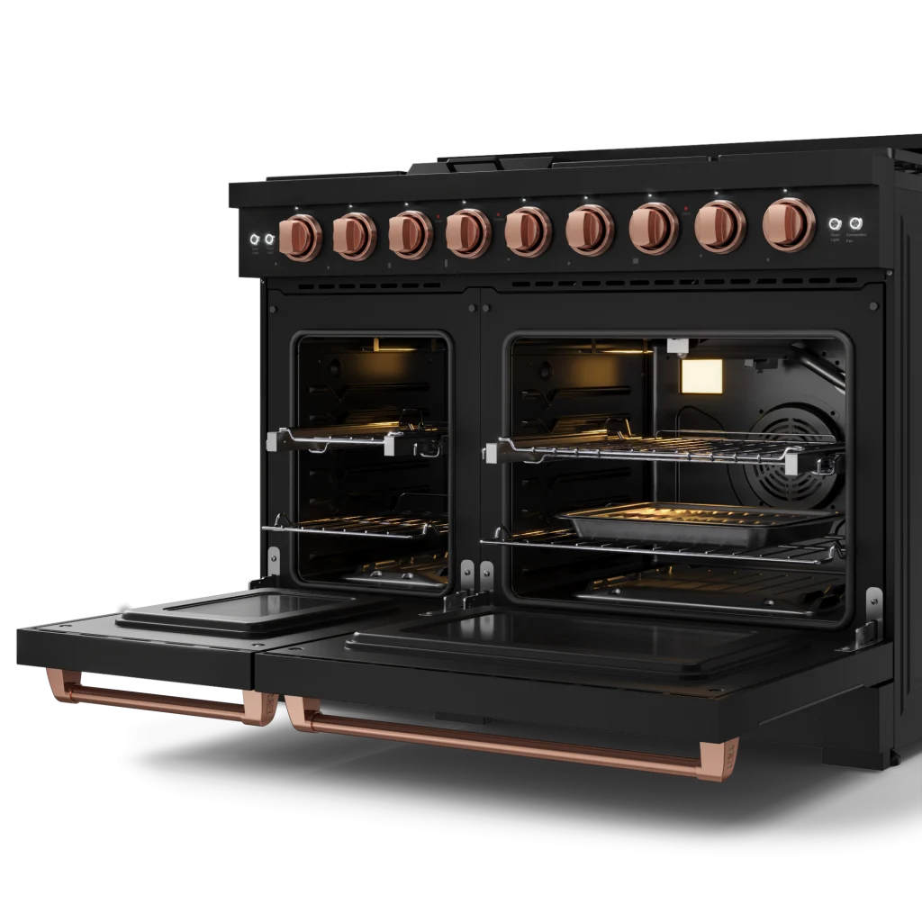 Designed for chefs who demand precision and power. With high-output burners, even heat distribution, and intuitive controls, this 48 Inch Gas range in Black/Rose Gold elevates your cooking experience. Built for durability and performance, it brings restaurant-grade quality to your home kitchen, making every meal exceptional.