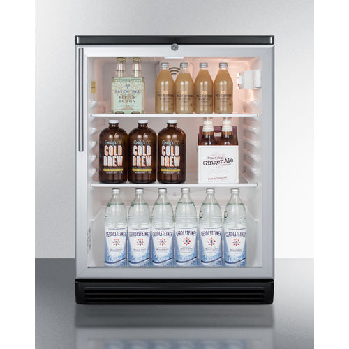 SUMMIT COMMERCIAL's freestanding SCR600BGL Series features conveniently sized beverage refrigerators designed and manufactured in Europe for quality storage and presentation in commercial establishments. Sized under 24" wide and deep, the SCR600BGLHV offers a generous 5.5 cu.ft. of storage capacity. The door features double pane tempered glass for added protection, with a brushed aluminum finish on the frame and our pro "HV" style vertically mounted thin handle in brushed stainless steel. The factory-installed front lock is located towards the top of the door for easier access. This unit comes with a black cabinet finish and is designed for freestanding use. Inside, the SCR600BGLHV includes four adjustable glass shelves for spill-proof storage and a half-sized wire shelf ideal for holding bottles in place. Automatic defrost ensures minimum user maintenance and a dial thermostat makes it simple to manage the temperature. This unit features an interior light operated with an ON/OFF rocker switch and a white interior finish to ensure optimum product visibility. Our unique "hidden" evaporator is located in the rear wall to help protect the unit's system and maximize shelf space. An internal fan helps to ensure the interior is more evenly cooled from top to bottom. The SCR600BGLHV is ETL-S listed to NSF-7 commercial standards. Built-in capable and ADA compliant choices are also available.