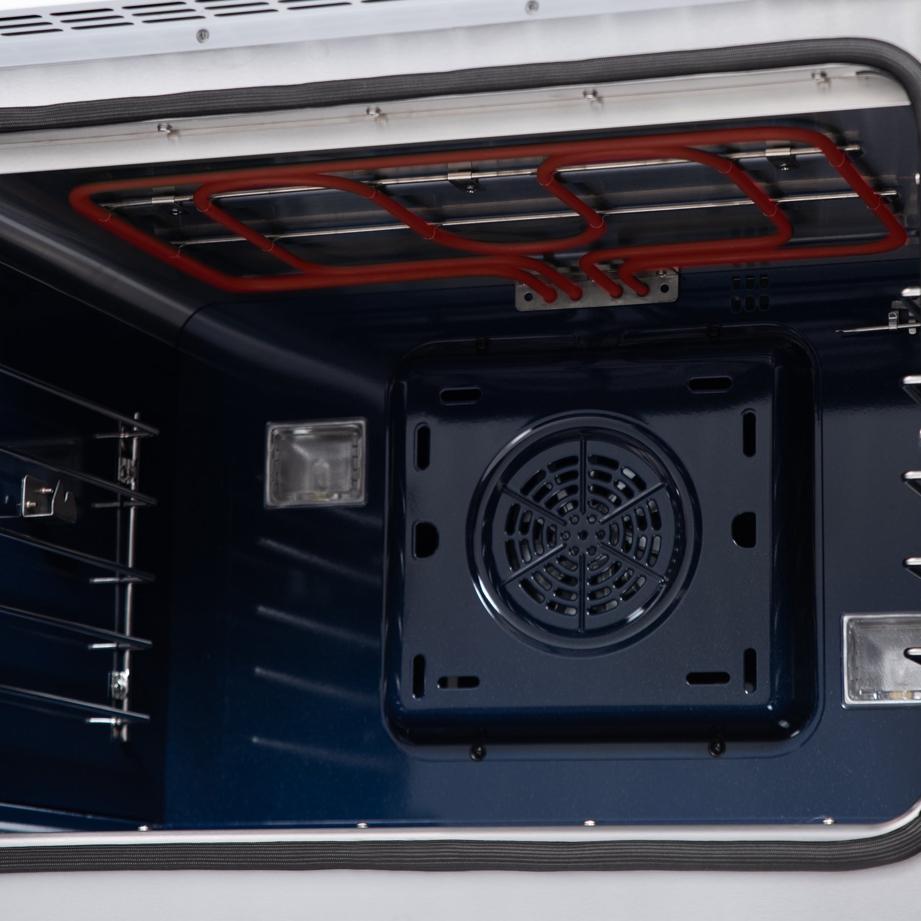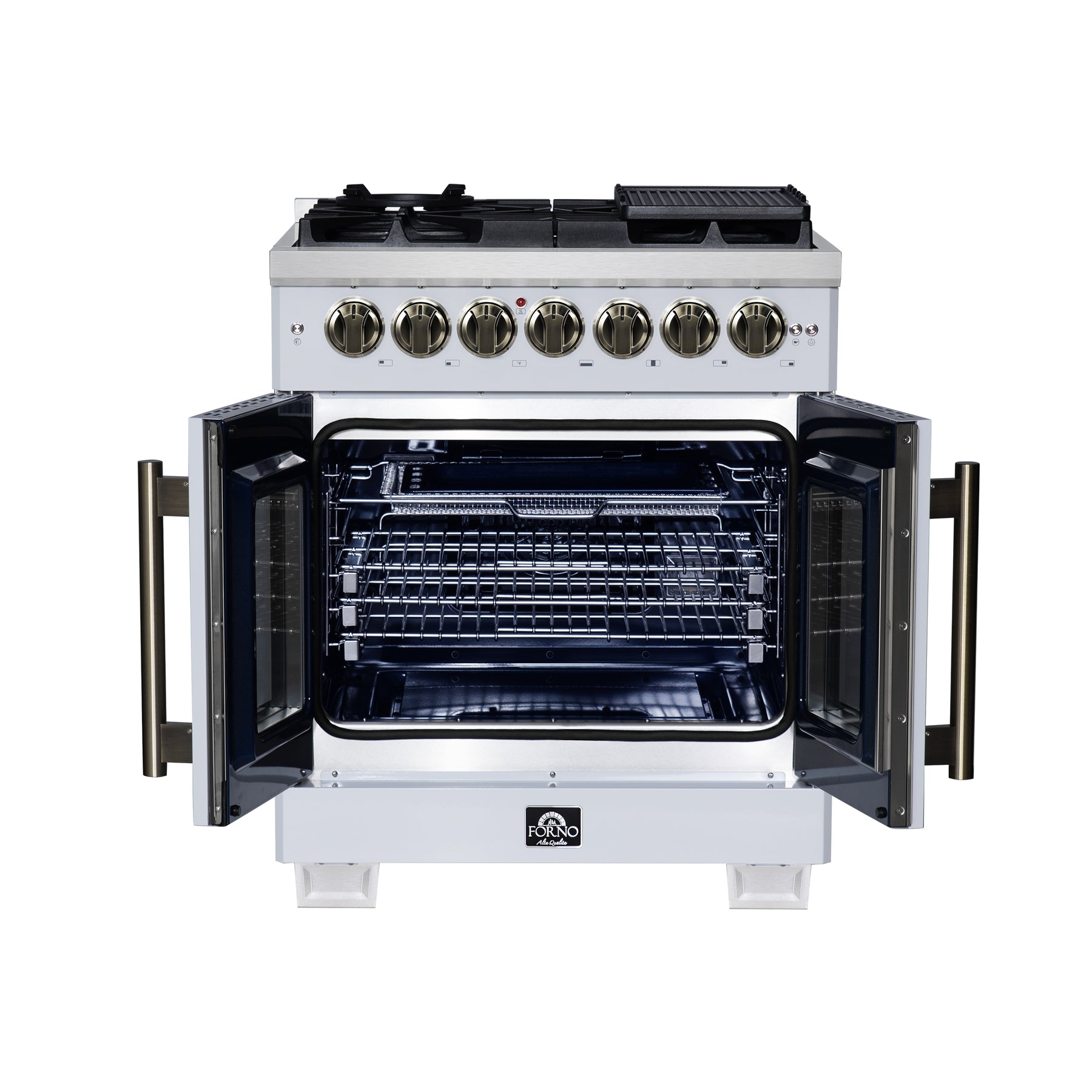 The Forno Capriasca 30 Inch French Door Dual Fuel Range in white with antique brass accessories brings professional-grade style and performance into your kitchen. Its signature French doors open outward to provide up to 12 inches of extra clearance, giving you easier access to the oven. The gas cooktop features five sealed dual-ring brass burners with a powerful 100,000 BTU total output, including a 20,000 BTU burner perfect for rapid boiling, high-heat searing, or gentle simmering of sauces and melted chocolate. Heavy-duty cast iron grates span the surface for maximum stability and smooth movement of cookware, while the recessed enamel cavity helps contain spills for effortless cleaning. Inside, the 4.32 cu. ft. electric oven delivers 6,300 watts of cooking power with true convection technology, ensuring fast, precise, and consistent results. A speckled blue enamel interior adds durability and easy maintenance, while the triple-layer glass oven door window provides clear visibility without sacrificing heat retention. The Capriasca also includes premium accessories: three stainless steel telescopic oven racks, an LP conversion kit, wok ring, reversible griddle, rotisserie kit with skewers, and an air fry basket with rack and drip pan.