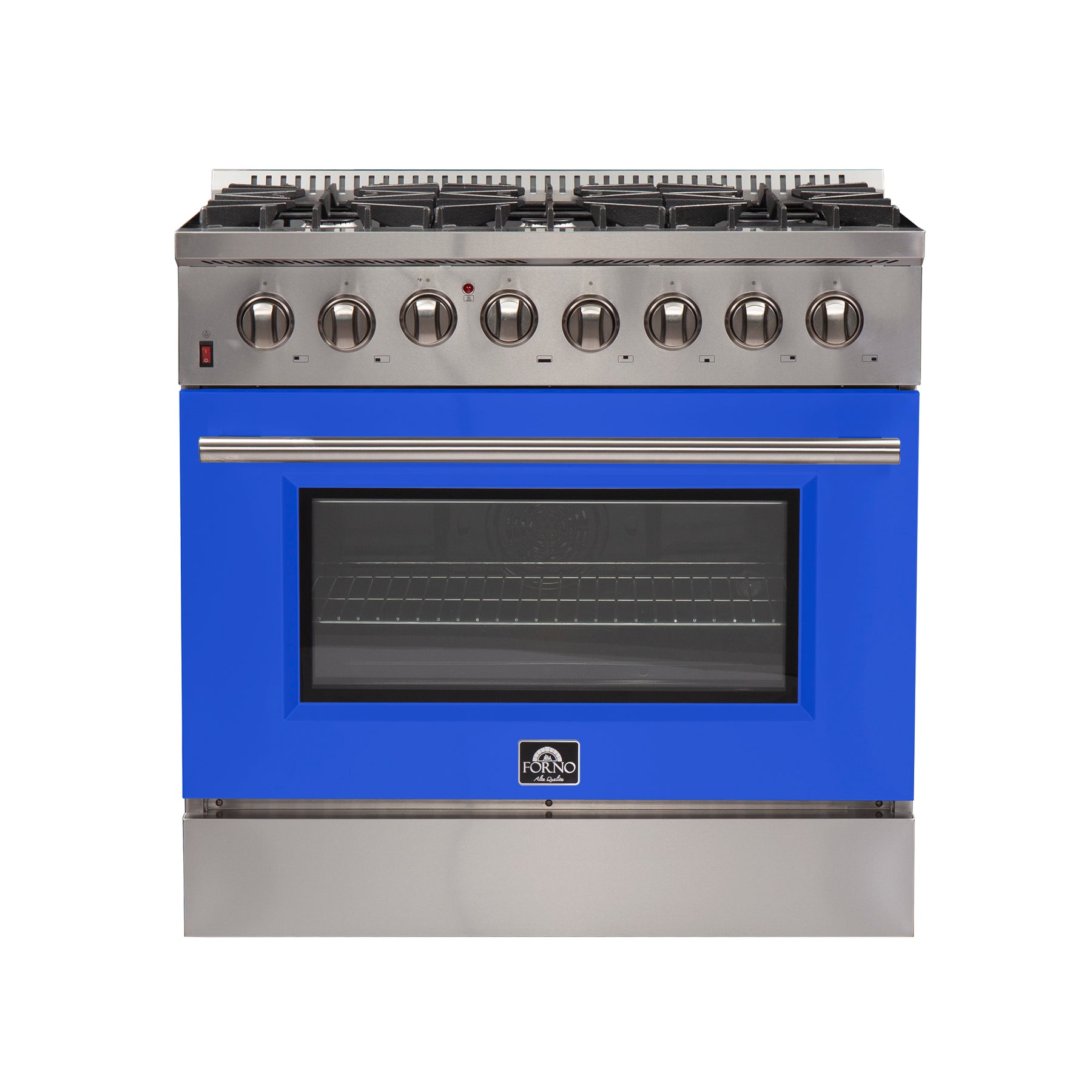 The Galiano 36" Dual Fuel Range blends professional style and performance with a durable stainless steel design and blue door. Featuring six sealed burners with a total output of 83,000 BTU, including a powerful 20K dual-ring burner for boiling or searing, it gently simmers delicate foods, such as chocolate and sauces. The cast iron grates provide stability and smooth pan sliding, while the 5.26 cu. ft. electric oven delivers 6,300 watts of power, making it perfect for baking, roasting, and broiling with true convection options. Included are two oven racks, an LP conversion kit, and elegant zinc-coated metal knobs with bezel rings that retain their beauty.