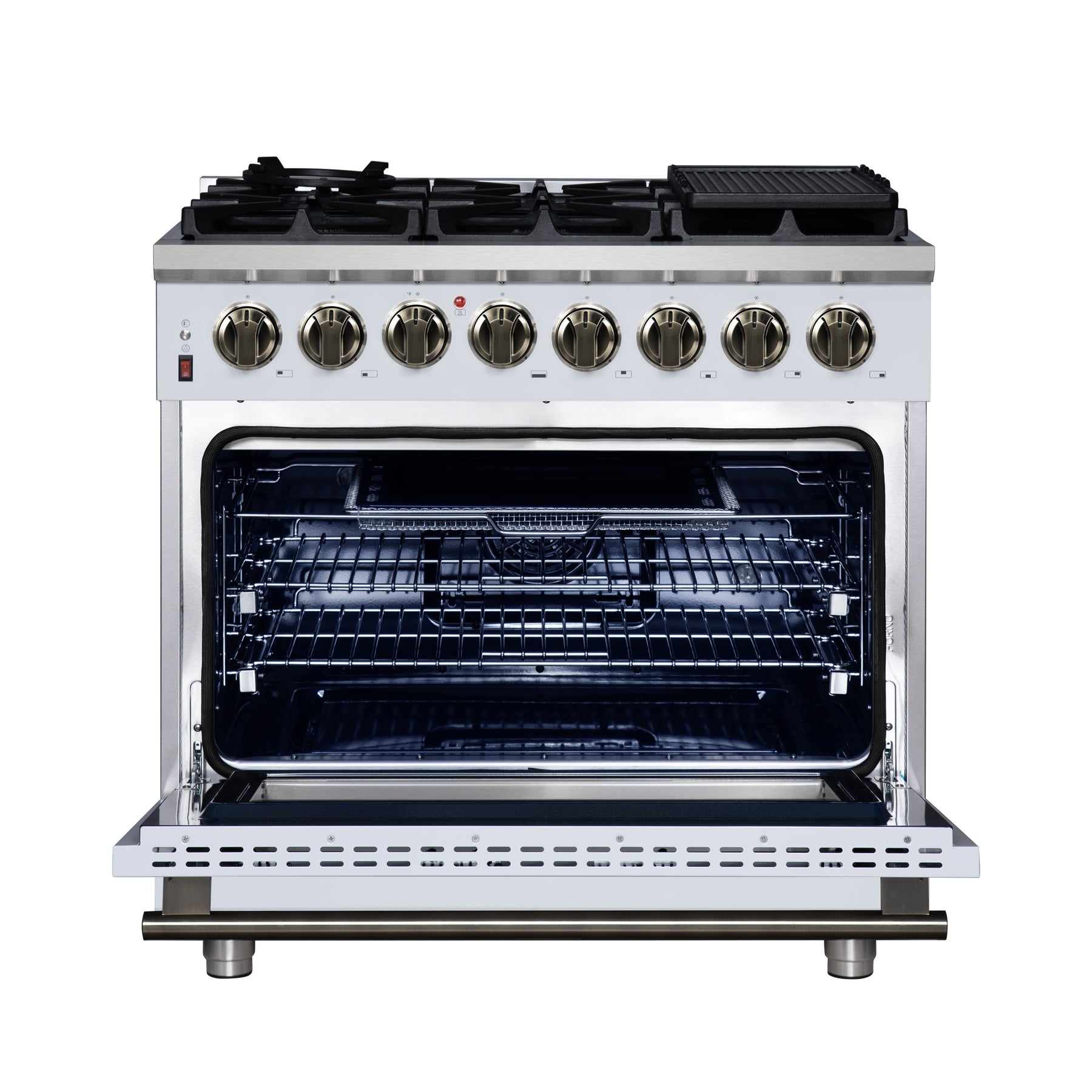 The Massimo 36 inch dual fuel range delivers powerful performance with elevated style. It features six sealed gas burners and matte cast iron grates, plus included accessories like a wok ring and removable griddle. The 5.36 cu. ft. electric oven offers true convection cooking, dual-element broiling, and five baking modes for maximum versatility. Designed in a sleek white finish with antique brass handles, this range includes a built-in air fryer basket, steam-clean oven, and a speckled blue enamel interior. LP gas convertible and suitable for both freestanding or built-in installations.