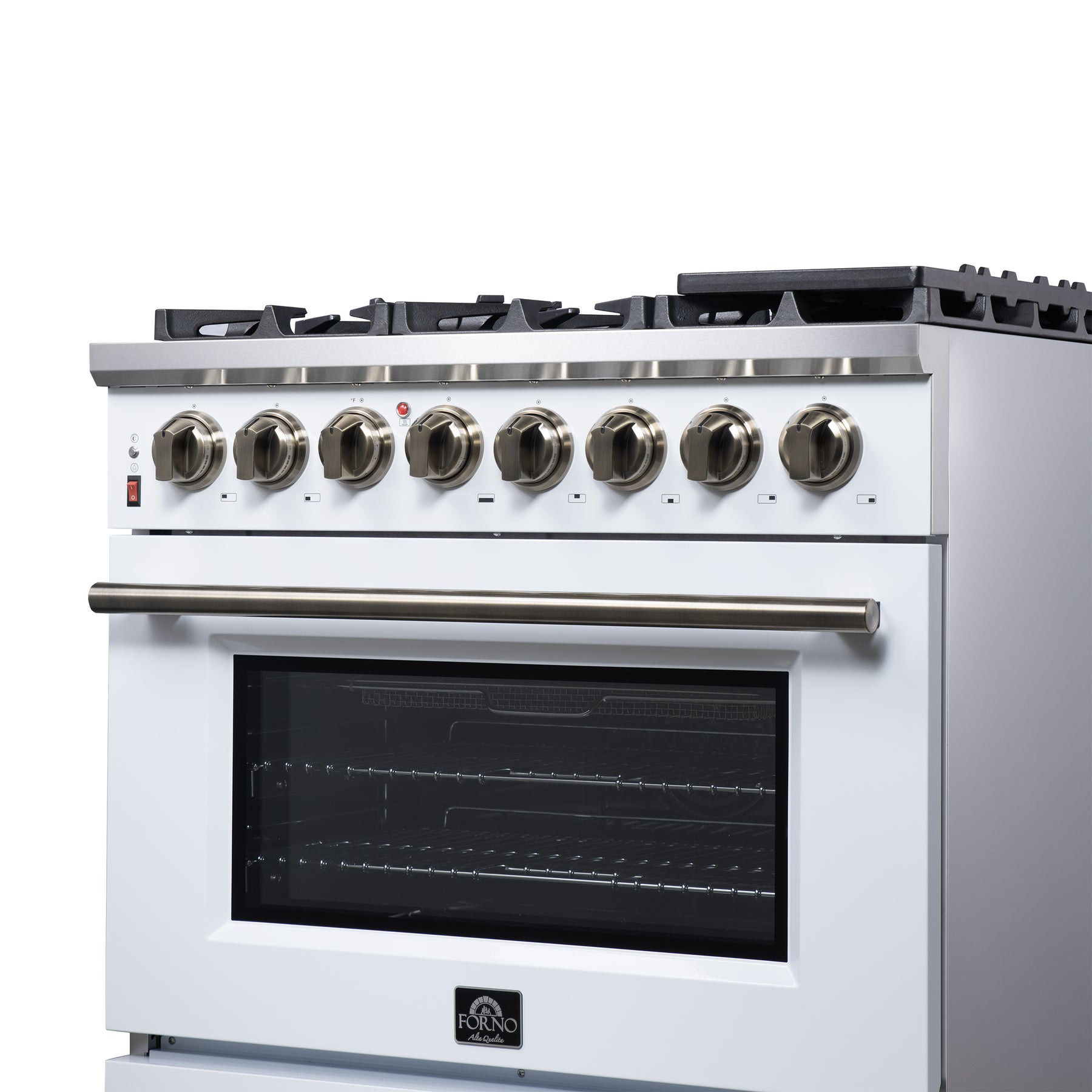 Forno Massimo 36 Inch Freestanding Dual Fuel Range in White with Antique Brass Accessories, 6 Burners, 5.36 cu. ft. Convection Oven