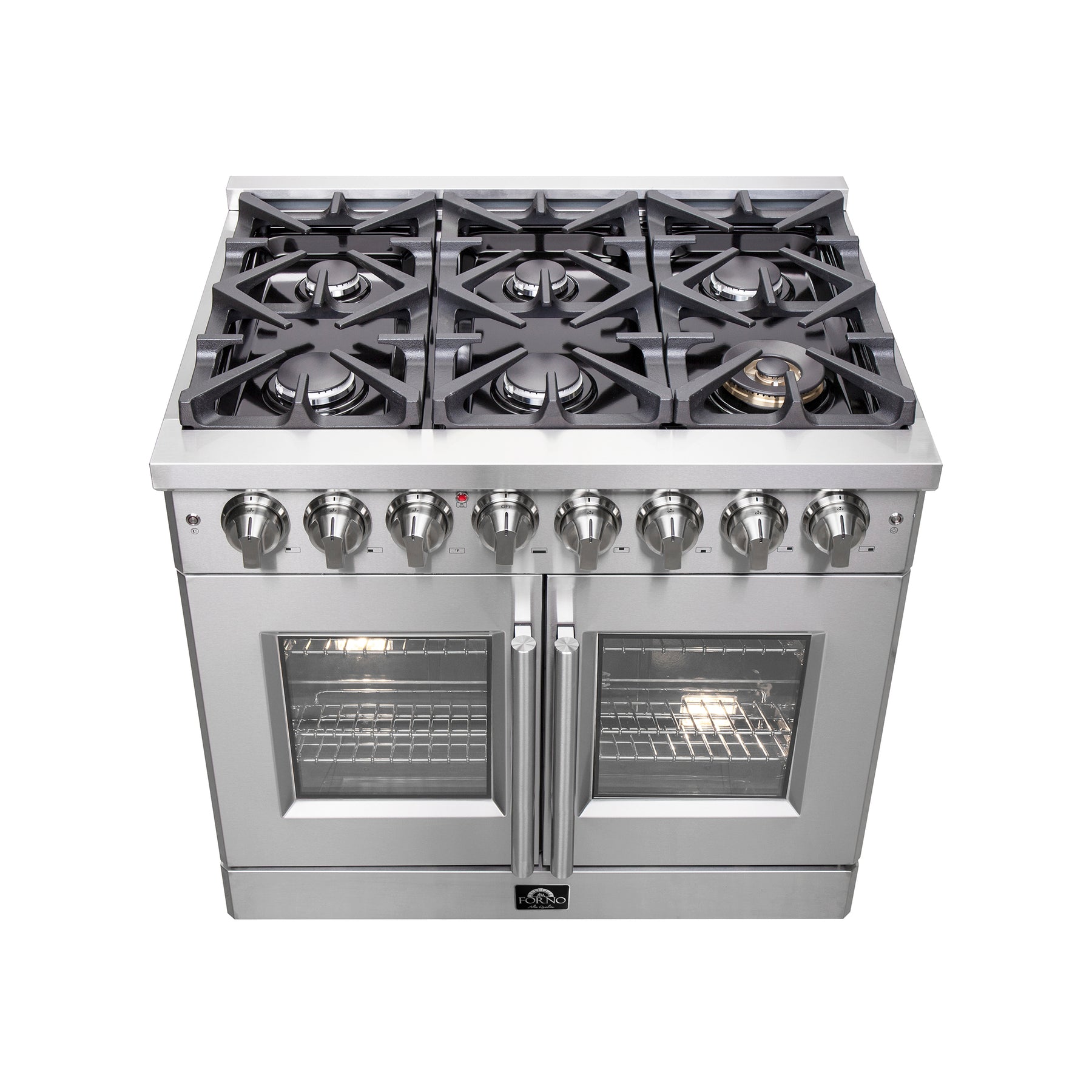 The Forno Massimo 36-Inch French Door Dual Fuel Range, harmonize professional styling and performance in a sleek stainless-steel design. The unique French doors offer convenient access, providing up to 12 inches of extra space around the oven. Featuring a powerful 20,000 BTU dual-ring brass burner, this range excels in tasks from boiling to searing, with precise simmering capabilities for delicate tasks like melting chocolate or simmering sauces. The heavy-duty continuous cast iron grates ensure stability for your cookware, while the recessed enamel cooking surface contains spills for easy cleanup. The 5.36 cu.ft. true convection fan oven boasts a blue enamel interior, simplifying maintenance while delivering a powerful 6,300 Watts output for impeccable baking, roasting, and broiling results. The 3-layer glass oven doors window retains heat and provides a clear view of your culinary creations. Included with the range are 2 telescopic oven racks, wok support, griddle, air-fryer kit with drip pan, a NEMA 14-50P power cord, and an LP conversion kit for added versatility. Plus, the zinc-coated metal knobs with bezel rings ensure lasting beauty for years to come, completing the sophisticated look of your kitchen space.