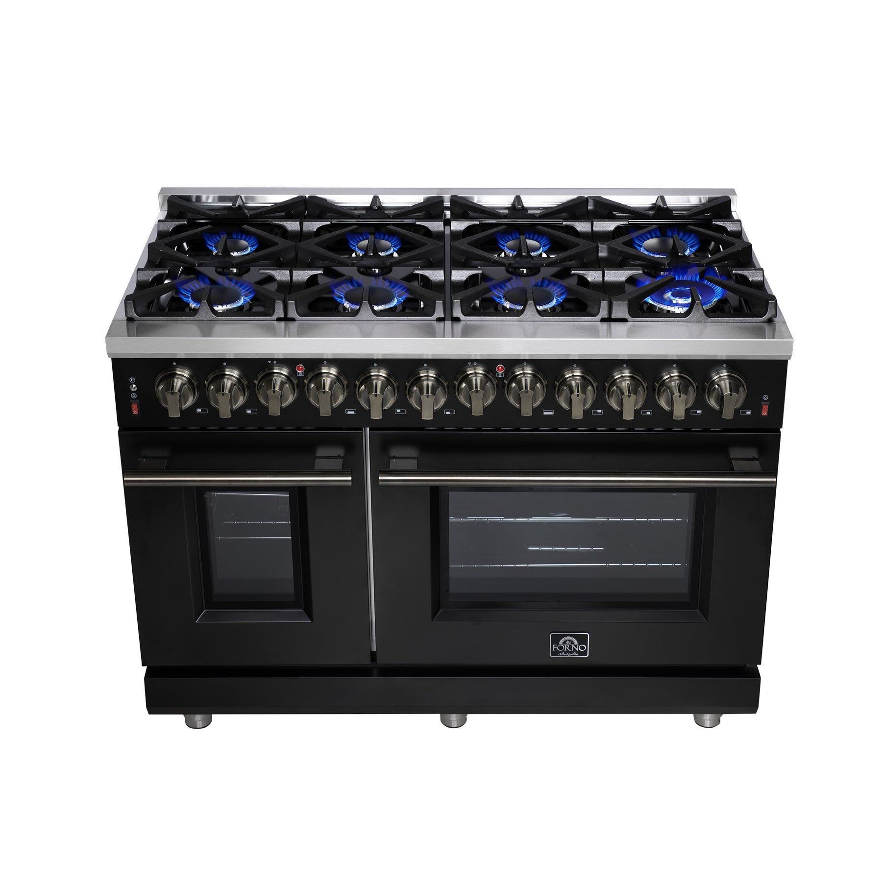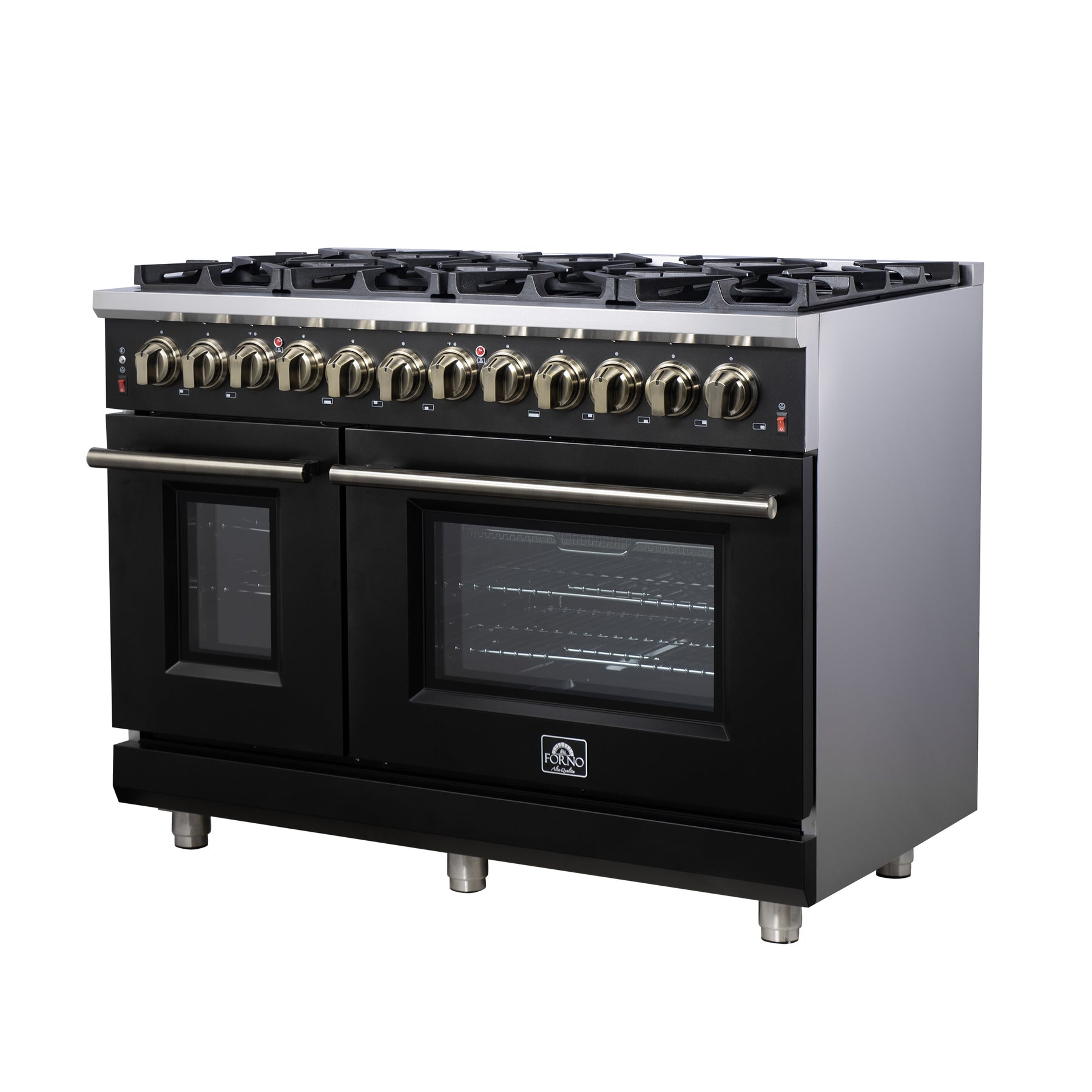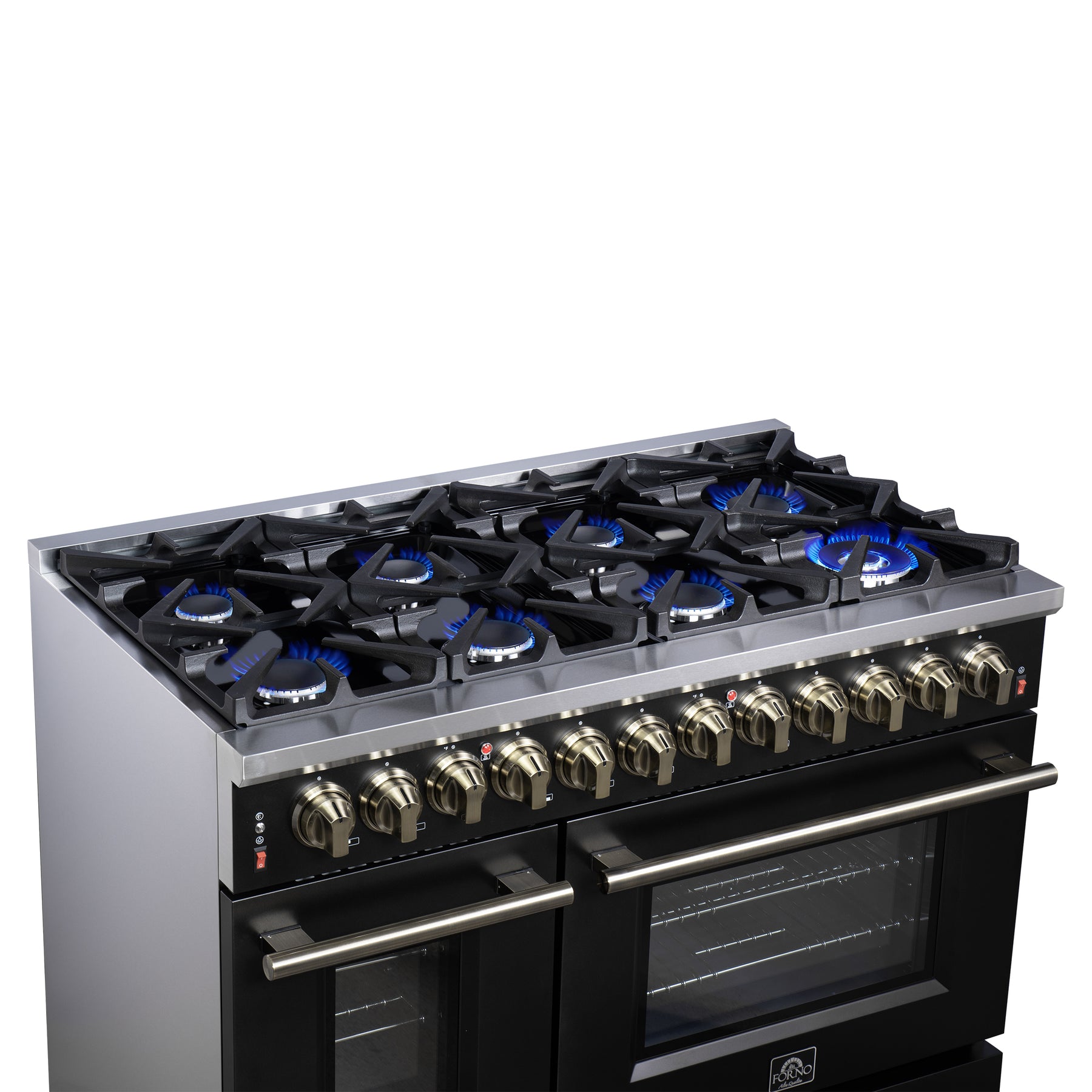 Forno Massimo 48 Inch Freestanding Dual Fuel Range in Black with Antique Brass Accessories, 8 Burners, 6.58 cu. ft. Convection Oven