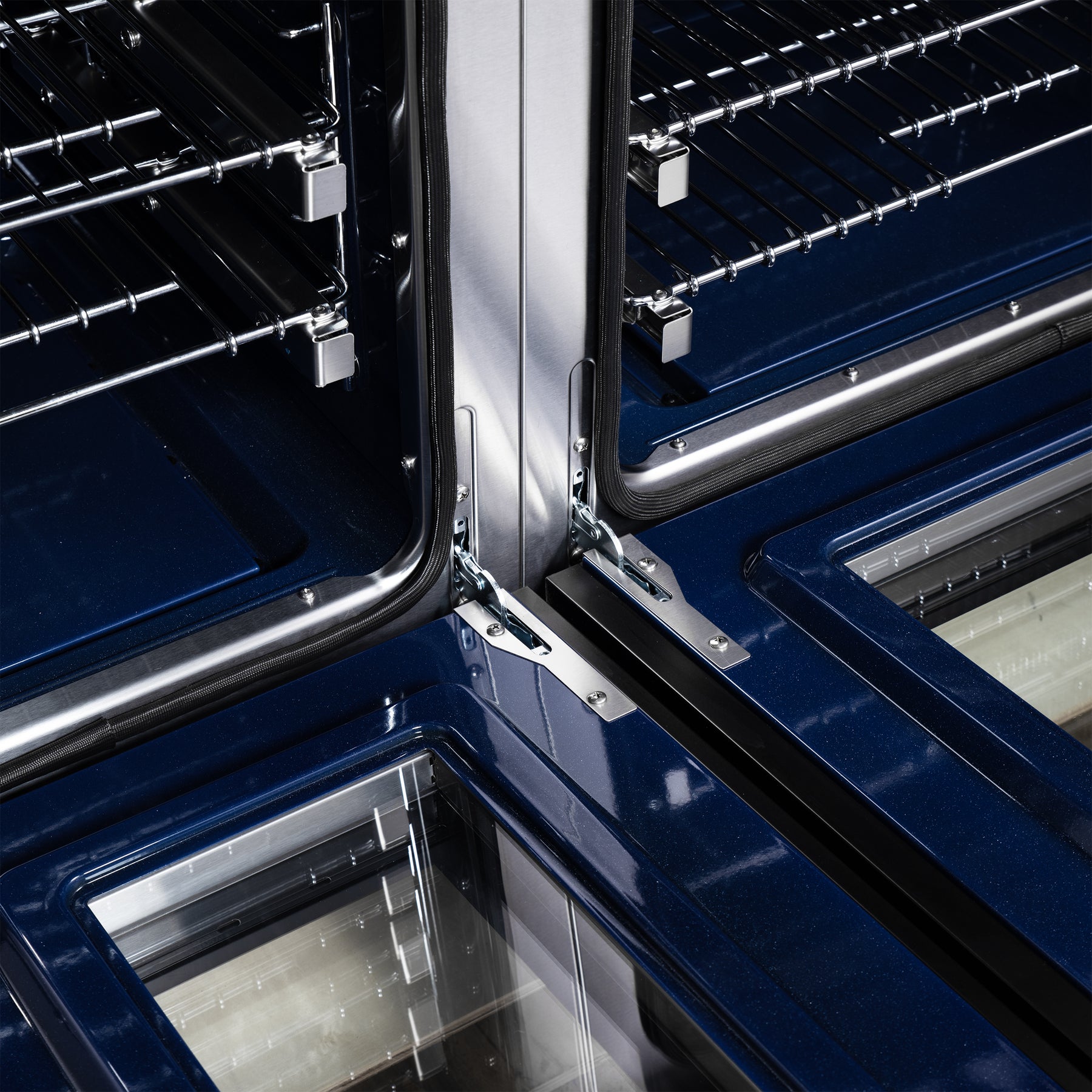 The Massimo 48 inch dual fuel range offers serious cooking power for high-performance kitchens. With 8 sealed gas burners and durable matte cast iron grates, it’s built for everything from rapid boiling to low simmers. The spacious 6.58 cu. ft. electric oven features true convection, multiple bake and broil modes, and a built-in air fryer basket for healthier meals. Finished in a bold black with antique brass handles, it also includes a wok support, griddle, and a steam-cleaning function for easy maintenance. The speckled blue enamel oven interior adds style and visibility. LP convertible and designed for either freestanding or built-in installation.