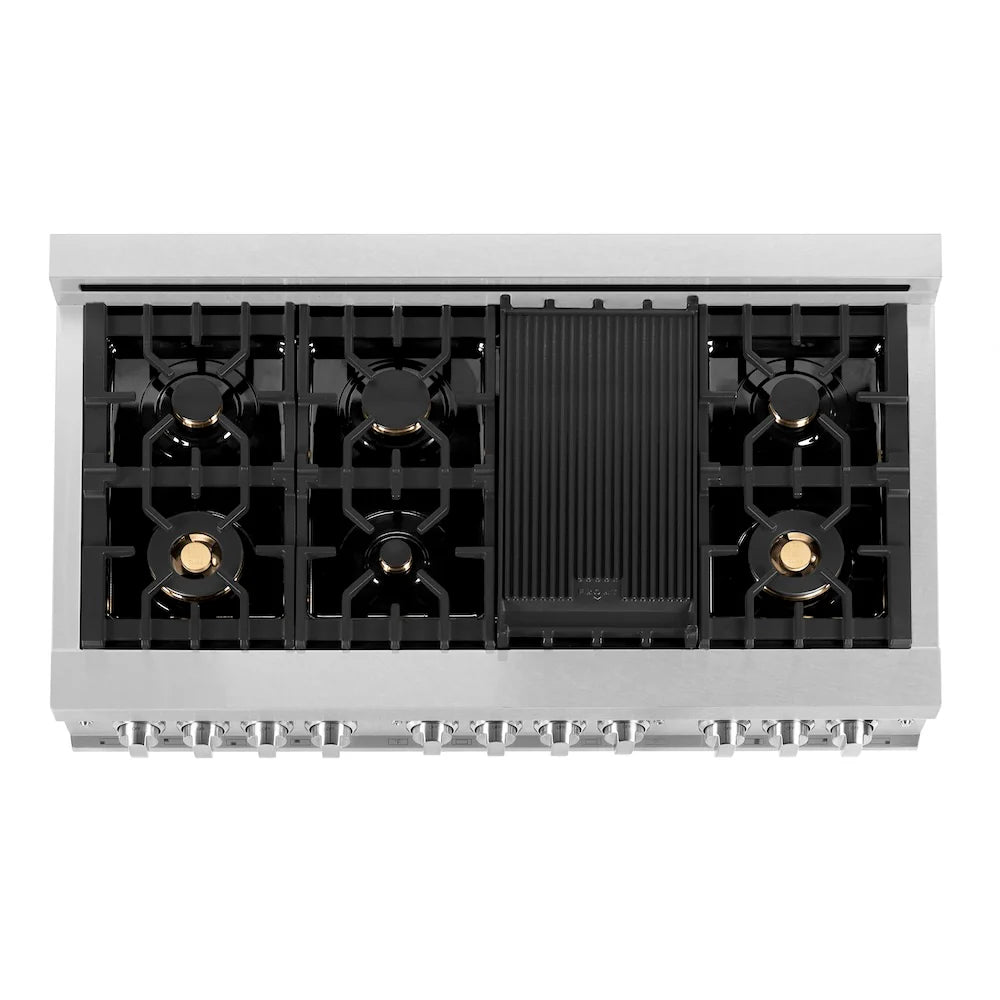 ZLINE 48 in. 6.0 cu. ft. Legacy Dual Fuel Range with Gas Cooktop and 2 Electric Ovens in Satin Stainless Steel with 6 Brass Burners (RAS-SN-BR-48)