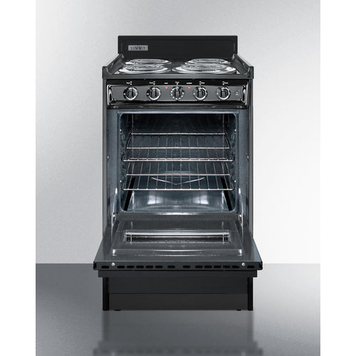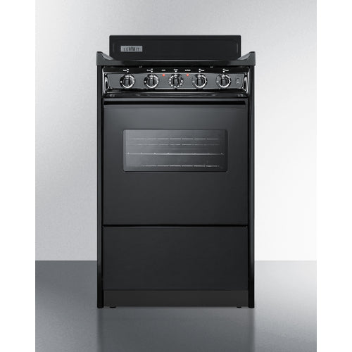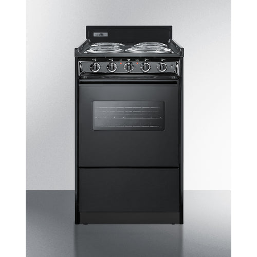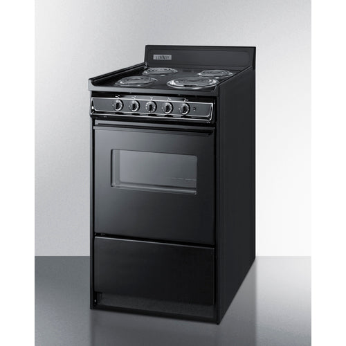Summit Appliance offers a wide selection of American-made household ranges built for long-lasting durability in space-challenged kitchens. The 23.2 amp design is ideal for kitchens with power limitations. The TEM110CW is an apartment-sized 220V electric range sized at just 20" wide, with a generous 2.46 cu.ft oven interior that can accommodate large trays. The oven window and interior light with an on/off switch make it easy to monitor your cooking without opening the door. Two adjustable oven racks are included. The waist-high broiler is located inside the oven, allowing you to switch functions without moving contents to a separate compartment on the floor. The lower drop-down storage compartment is ideal for keeping pots and pans out of the way in small kitchens. Designed to meet the most current UL safety standards, this unit features one 8" 950W and three 6" 650W coil elements. These operate at lower wattage than standard electric ranges, allowing for a slow but steady heating process that will not cycle off. Upfront push-to-turn knobs offer additional protection, ensuring users won't reach over hot burners to adjust the heat. This unit complies with ADA guidelines. The TEM110CW comes in a jet black finish to suit any kitchen. It has a recessed oven door and is conveniently sized at just 24" deep for a better fit in galley in L-shaped kitchens, where every inch counts. Porcelain and steel construction help the unit hold up to years of daily use. We include an anti-tip bracket for added safety. This unit does not include a line cord (a standard 25 or 30 amp 3 or 4-wire range cord can be installed by your electrician). With its classic style and quality construction, Summit's made in the USA cooking line offers reliable cooking for smaller homes. Additional choices are available in 24", 30", and 36" wide fits.