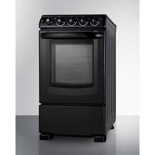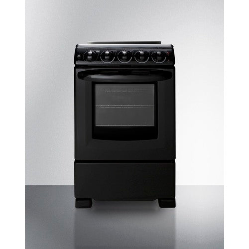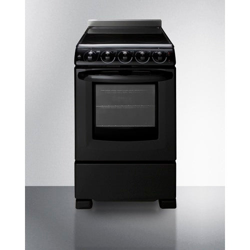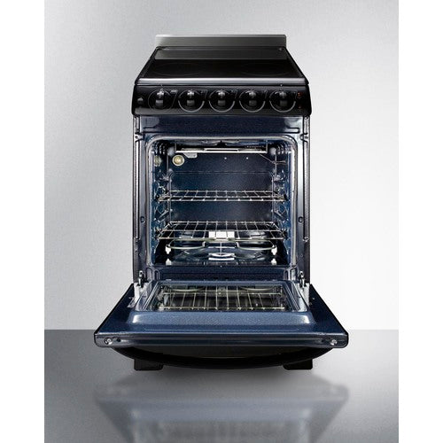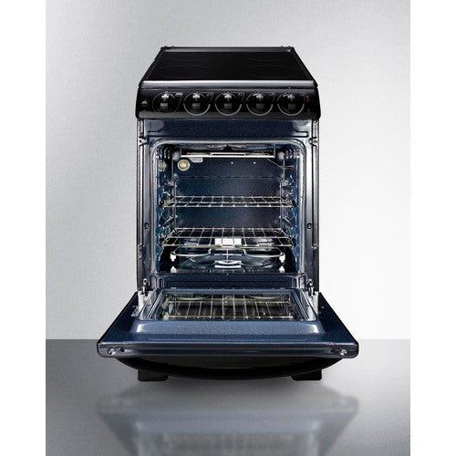 Summit's White Pearl series of North American ranges offers full cooking convenience for apartments and other settings with smaller kitchen spaces. The REX2051BRT is a 220V electric range sized at just under 20" wide in a jet black finish. The versatile design includes a removable 2" high stainless steel backguard, allowing you the choice of a standard range style or a slide-in look with a flat surface that allows you to better integrate the unit with your own backsplash design. The smooth ceramic glass surface includes four 1200W 6 1/2" elements, with a hot surface indicator light for added safety. Inside, the REX2051BRT features a large 2.3 cu.ft. oven made from durable porcelain enamel. The waist-high broiler function is easy to use, with slide-out oven racks that can be adjusted in four different glide positions for the best fit. We include a small two-piece porcelain broiler tray with a grill cover. The large oven window and interior light make it easy to monitor your cooking. Designed and constructed in North America, the REX2051BRT is the perfect choice for smaller kitchens with full cooking needs. Additional choices are available in 24" wide fits. Browse our website to view our complete collection.