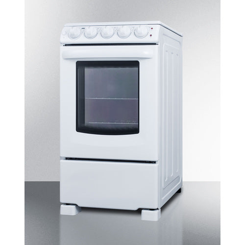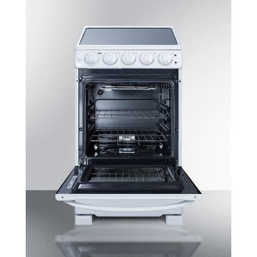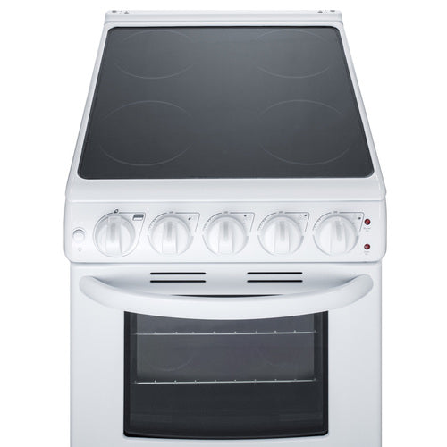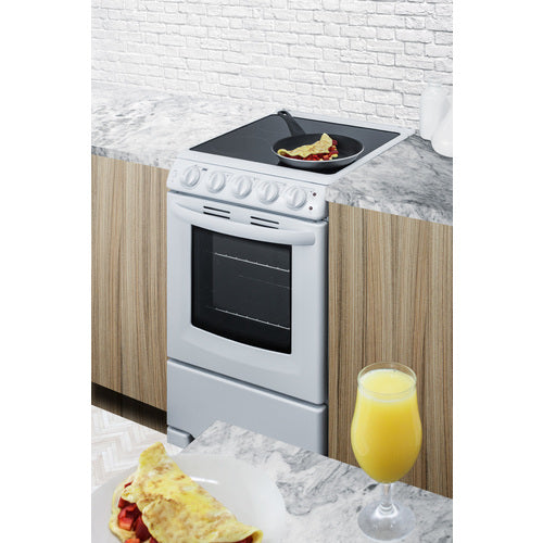 Summit's White Pearl series of North American ranges offers full cooking convenience for apartments and other settings with smaller kitchen spaces. The REX2051WRT is a 220V electric range sized at just under 20" wide in a classic white finish. The versatile design includes a removable 2" high stainless steel backguard, allowing you the choice of a standard range style or a slide-in look with a flat surface that allows you to better integrate the unit with your own backsplash design. The smooth ceramic glass surface includes four 1200W 6 1/2" elements, with a hot surface indicator light for added safety. Inside, the REX2051WRT features a large 2.3 cu.ft. oven made from durable porcelain enamel. The waist-high broiler function is easy to use, with slide-out oven racks that can be adjusted in four different glide positions for the best fit. We include a small two-piece porcelain broiler tray with a grill cover. The large oven window and interior light make it easy to monitor your cooking. Designed and constructed in North America, the REX2051WRT is the perfect choice for smaller kitchens with full cooking needs. Additional choices are available in 24" wide fits. Browse our website to view our complete collection.