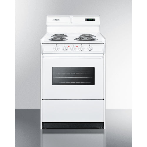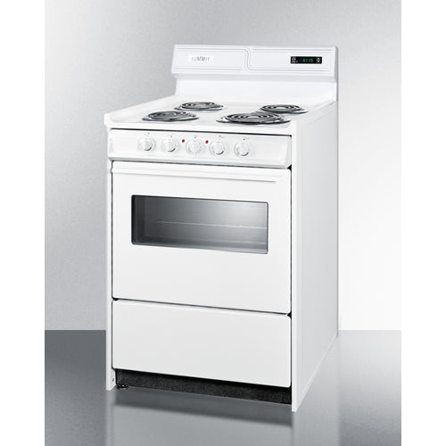 Summit Appliance offers a wide selection of American-made household ranges built for long-lasting durability in space-challenged kitchens. The 23.2 amp design is ideal for kitchens with power limitations. The WEM630KW is an apartment-sized 220V electric range sized at just 24" wide, with a generous 2.92 cu.ft oven interior that can accommodate large trays. The oven features a door window and interior light with an on/off switch to make it easy to monitor your cooking without opening the door. Two adjustable oven racks are included. The waist-high broiler is located inside the oven, allowing you to switch functions without moving contents to a separate compartment on the floor. The lower drop-down storage compartment is ideal for keeping pots and pans out of the way in small kitchens. Designed to meet the most current UL safety standards, this unit features one 8" 950W and three 6" 650W coil elements. These operate at lower wattage than standard electric ranges, allowing for a slow but steady heating process that will not cycle off. Upfront push-to-turn knobs offer additional protection, ensuring users won't reach over hot burners to adjust the heat. This unit complies with ADA guidelines. The WEM630KW comes in a classic white finish to suit any kitchen. It has a recessed oven door and is conveniently sized at just 24" deep for a better fit in galley in L-shaped kitchens, where every inch counts. Porcelain and steel construction help the unit hold up to years of daily use. We include an anti-tip bracket for added safety. This unit does not include a line cord (a standard 25 or 30 amp 3 or 4-wire range cord can be installed by your electrician). With its classic style and quality construction, Summit's made in the USA cooking line offers reliable cooking for smaller homes. Additional choices are available in 20", 30", and 36" wide fits.