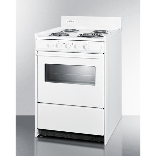 Summit Appliance offers a wide selection of American-made household ranges built for long-lasting durability in space-challenged kitchens. The 23.2 amp design is ideal for kitchens with power limitations. The WEM610W is an apartment-sized 220V electric range sized at just 24" wide, with a generous 2.92 cu.ft oven interior that can accommodate large trays. The oven window and interior light with an on/off switch make it easy to monitor your cooking without opening the door. Two adjustable oven racks are included. The waist-high broiler is located inside the oven, allowing you to switch functions without moving contents to a separate compartment on the floor. The lower drop-down storage compartment is ideal for keeping pots and pans out of the way in small kitchens. Designed to meet the most current UL safety standards, this unit features one 8" 950W and three 6" 650W coil elements. These operate at lower wattage than standard electric ranges, allowing for a slow but steady heating process that will not cycle off. Upfront push-to-turn knobs offer additional protection, ensuring users won't reach over hot burners to adjust the heat. This unit complies with ADA guidelines. The WEM610W comes in a classic white finish to suit any kitchen. It has a recessed oven door and is conveniently sized at just 24" deep for a better fit in galley in L-shaped kitchens, where every inch counts. Porcelain and steel construction help the unit hold up to years of daily use. We include an anti-tip bracket for added safety. This unit does not include a line cord (a standard 25 or 30 amp 3 or 4-wire range cord can be installed by your electrician). With its classic style and quality construction, Summit's made in the USA cooking line offers reliable cooking for smaller homes. Additional choices are available in 20", 30", and 36" wide fits.