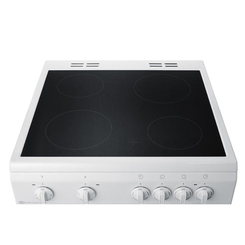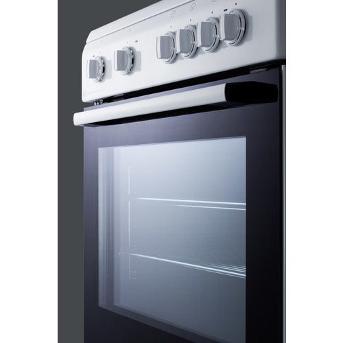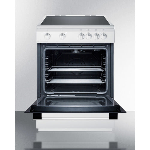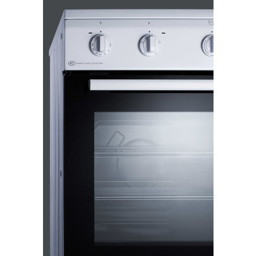 The Summit Classic Collection features deluxe appliances designed to bring modern luxury into the home. Made in Europe, the CLRE24WH is a 24" wide 220V electric range with a smooth Schott ceramic glass surface for safer heating with easy cleanup. Two 7.5" burners and two 6" burners accommodate a variety of cookware sizes. All push-to-turn cooking controls are located upfront, eliminating the danger of reaching across the cooktop surface. Indicator lights illuminate when the burners and oven are on for added kitchen safety. This unit features a 'slide-in' look without a backguard, ideal for integrating the stove into your own wall or backsplash design. The large oven window provides a full view of your cooking, with an interior light that automatically turns on with the oven. The oven door is constructed from sleek black glass for a modern look, with a clean white finish on the cabinet, storage drawer, and manifold. Inside, the 2.4 cu.ft. interior includes two sliding wire racks with five positions to let you fit various dish sizes. Cooking settings include a low and high broil option, as well as a bottom heat function ideal for certain applications. This unit's accessible design meets ADA guidelines. With its elegant design and user-friendly features, the CLRE24WH makes a stunning addition to any home kitchen.