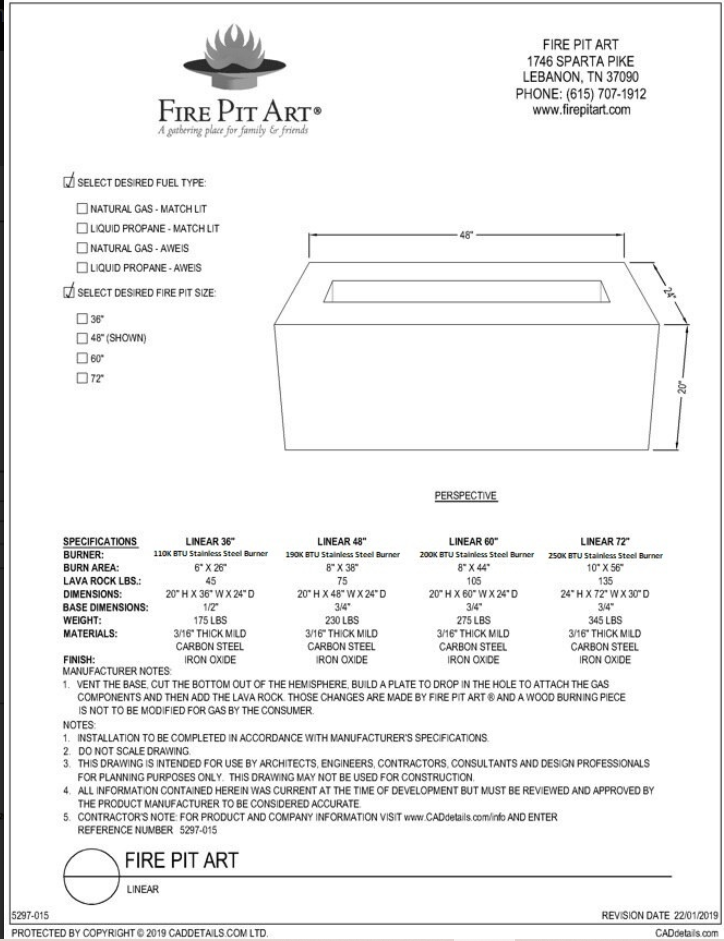 Fire Pit Art Linear 48" Natural Gas Match Lit System 24" Deep