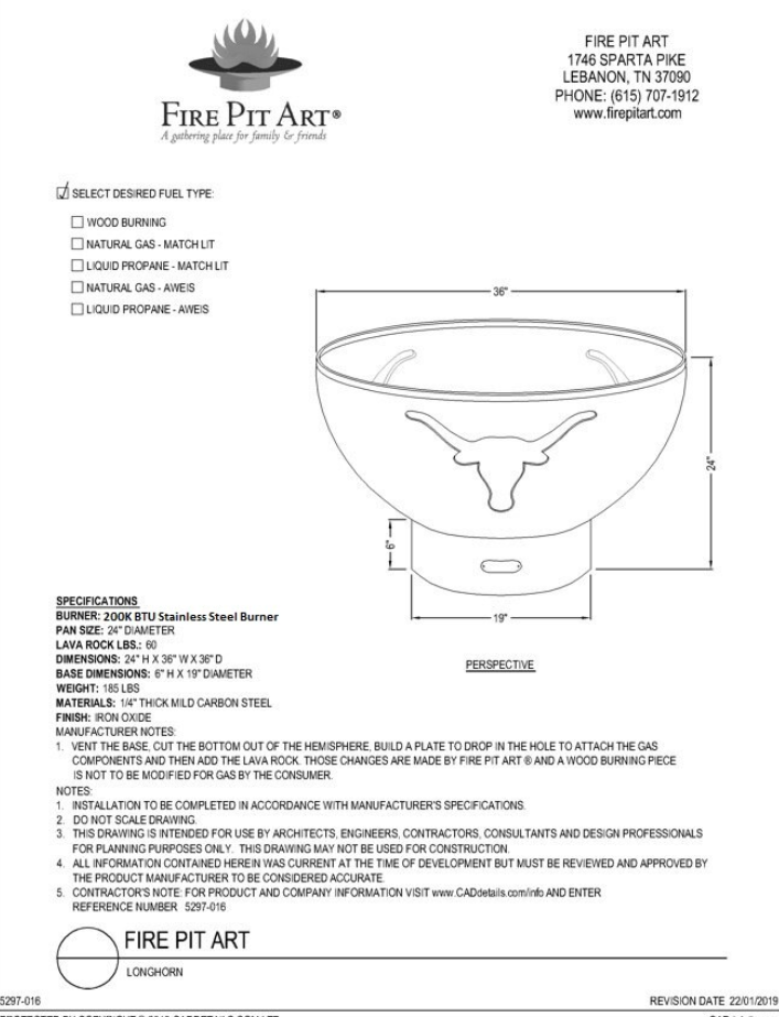 The Liquid Propane and Natural Gas burning variants of the Long Horn Fire Pit include a Penta 24" 200K BTU burner.  This burner provides a flame that is great for small to medium sized gatherings.  The package also includes a whistle free flex line, Dante valve, burner plate, and lava rock. We hope your Fire Pit Art® provides many wonderful memories for your family and friends.
