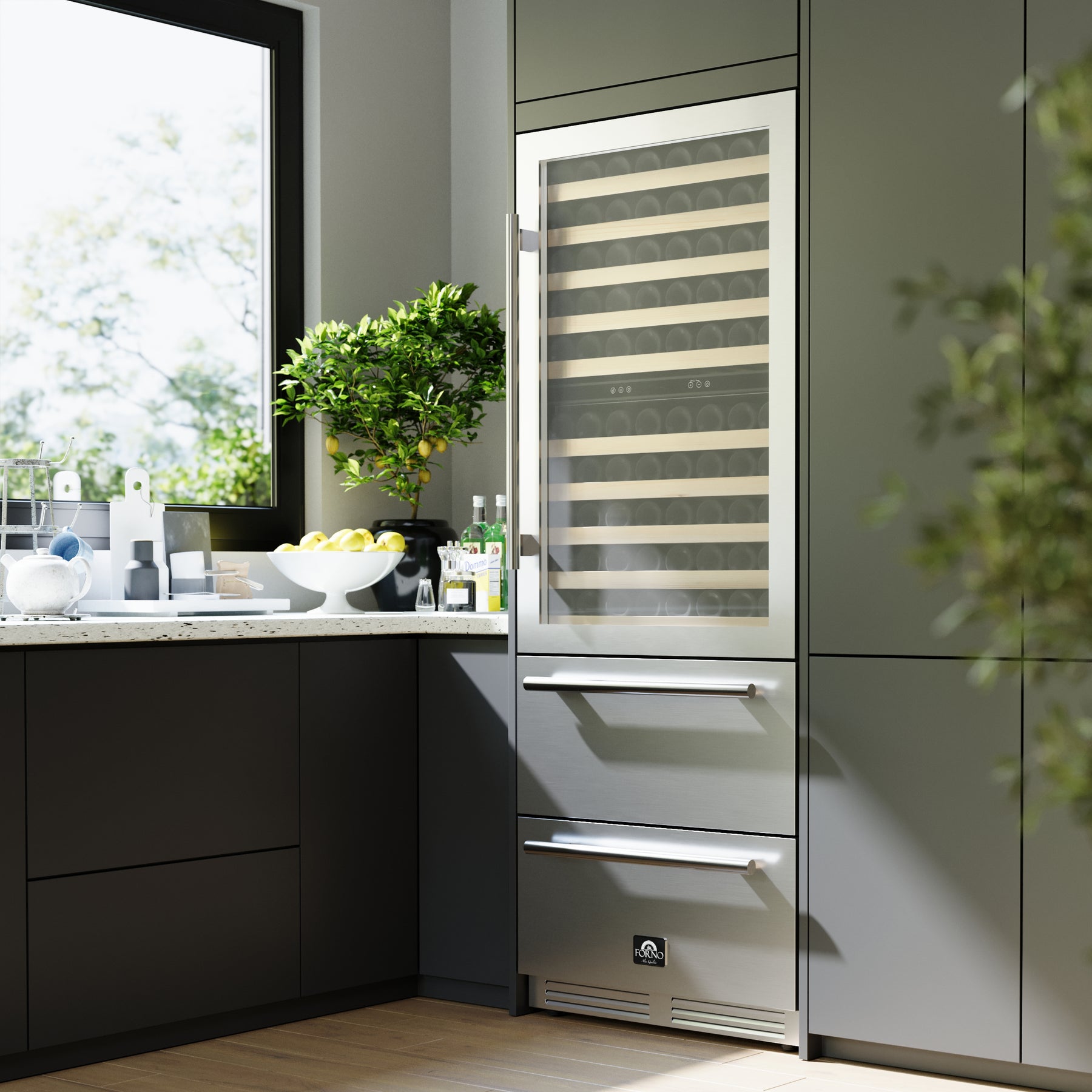 The Forno Celano 30" Dual Zone Wine Cellar & Beverage Cooler offers premium storage with a sleek, built-in design. Dual cooling zones provide precise temperature control for red and white wines, while ten telescopic shelves accommodate up to 150 bottles. Two stainless steel beverage drawers hold up to 252 cans, with a built-in divider for effortless organization. A high-efficiency compressor ensures consistent cooling with minimal energy consumption, while the triple-layer anti-UV glass doors protect your collection from light exposure. The stainless steel finish, hidden hinges, and flat back design create a seamless, modern look that integrates beautifully into any space. A touchpad controller with a white LCD display allows for precise temperature adjustments, and bright LED interior lighting ensures clear visibility. Designed for full built-in installation, the Celano features a reversible door for flexible placement, a charcoal air filter to neutralize odors, and quiet operation for minimal noise.