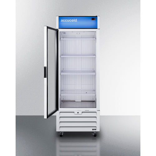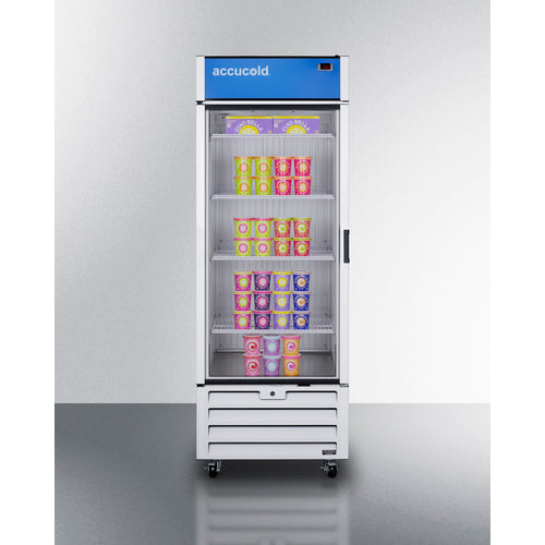 Made in North America, Accucold Commercial products offer the ideal display and storage conditions for foodservice settings, with a TAA compliant design and durable construction for busy commercial environments. Model SCFF262GLH is an upright frost-free freezer with a full 21.34 cu.ft. storage capacity. Ideal for hotel lobbies, this unit comes with a double tempered glass door complete with LED lighting inside the panel to provide a bright view of stored items for maximum impulse sales. The door has a left hand swing for easy pairing with its matching SCRR261G refrigerator. The self-closing feature protects stored contents by ensuring they're not accidentally left exposed to ambient room temperatures. This unit includes a factory-installed keyed lock for security as needed. Inside, the SCFF262GLH utilizes fan-forced cooling for fast temperature recovery and even cold air distribution. Adjustable cantilevered shelving makes it easy to accommodate any sized item. This model uses frost-free operation for easy user maintenance, with audible high/low temperature alarms to warn if the unit goes out of range. The SCFF262GLH is UL-S listed to NSF-7 commercial standards. Eco-friendly R290a refrigerant helps to ensure a greener footprint compliant with the latest CARB regulations. In addition to this model, Accucold Commercial's North American line includes larger and smaller sizes to best fit your space. Explore the full selection or contact our product specialists for more information. Note: This unit ships with a left hand door swing. For a right hand version, see the SCFF262GRH.