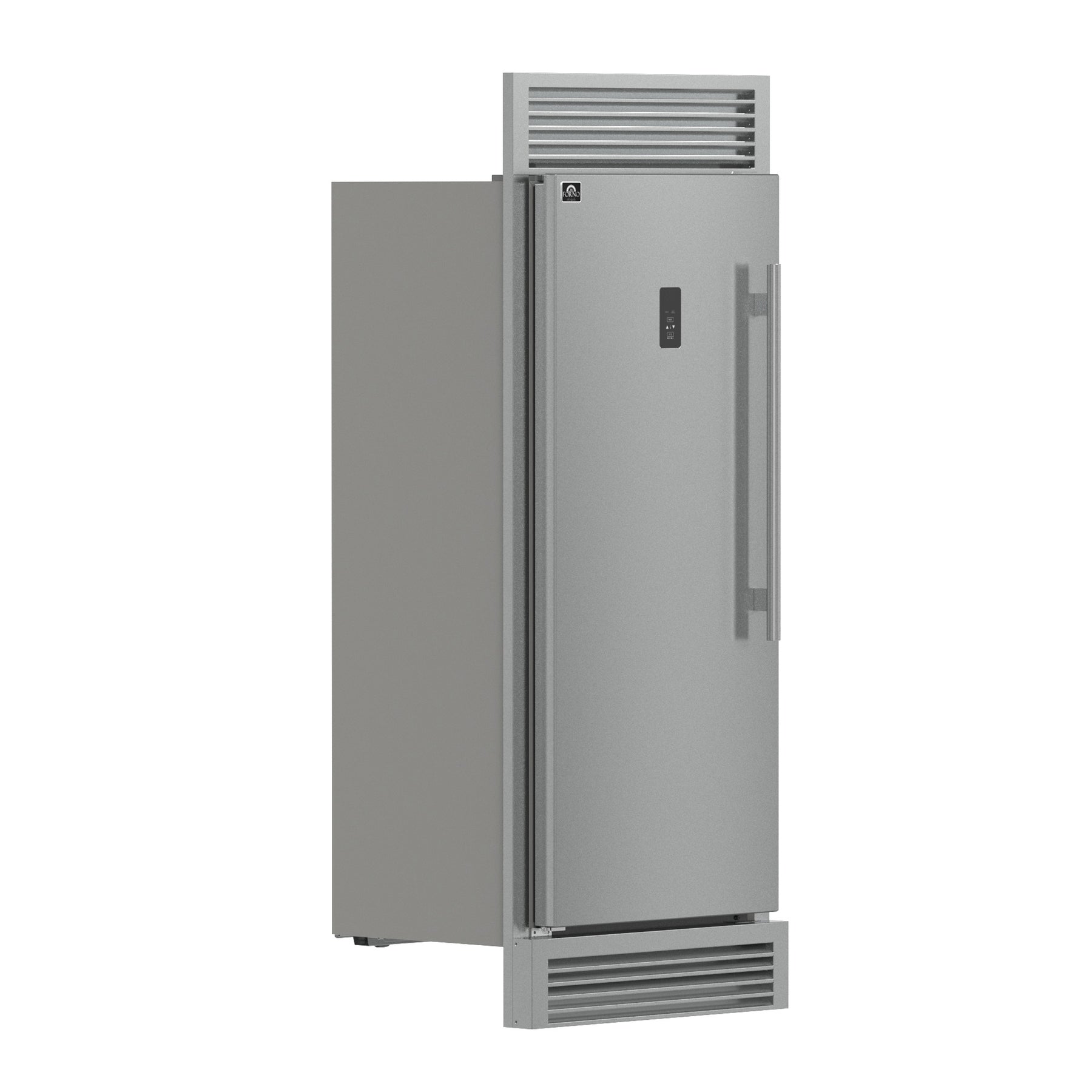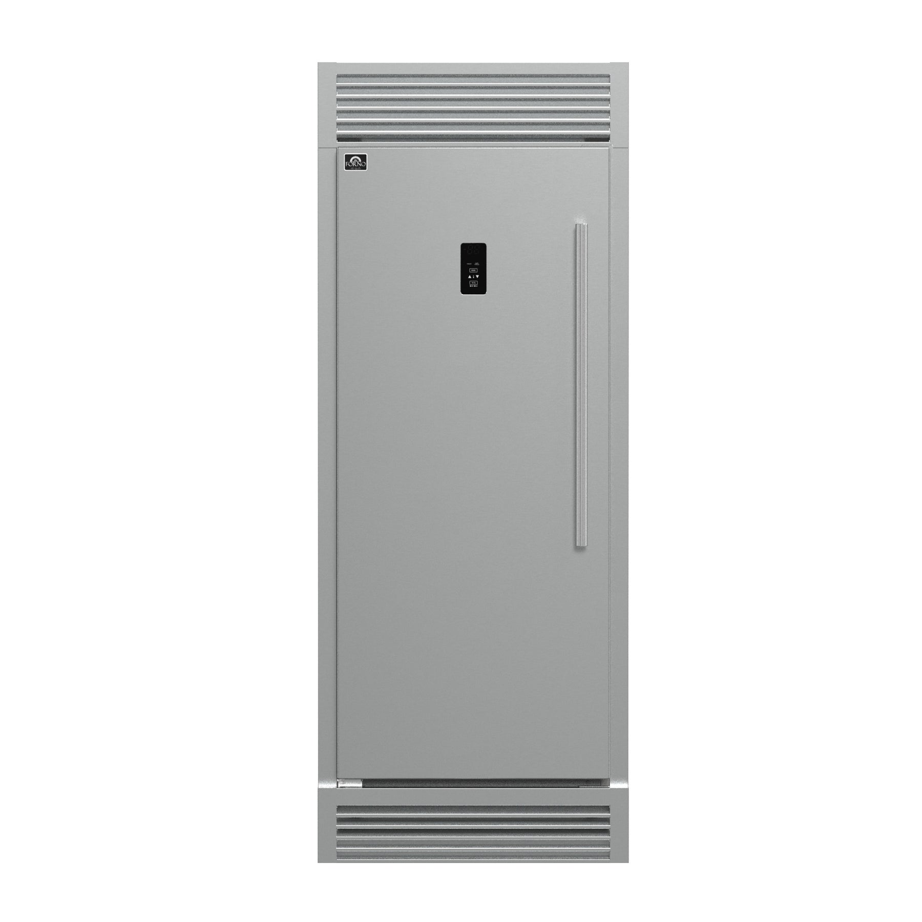The Forno Fortezza 32 Inch Left-Swing Freezer with Trim Grill has Total No Frost cooling and an Energy Star certification, keeping interior temperatures steady without manual defrosting. Inside, you'll find adjustable shelving, door storage, and a galvanized steel-coated interior for long-lasting performance. The digital control panel offers precise temperature settings from -24°C to -14°C, while the Fast Freeze function locks in freshness quickly. An automatic filtered ice maker delivers crescent-shaped cubes on demand.