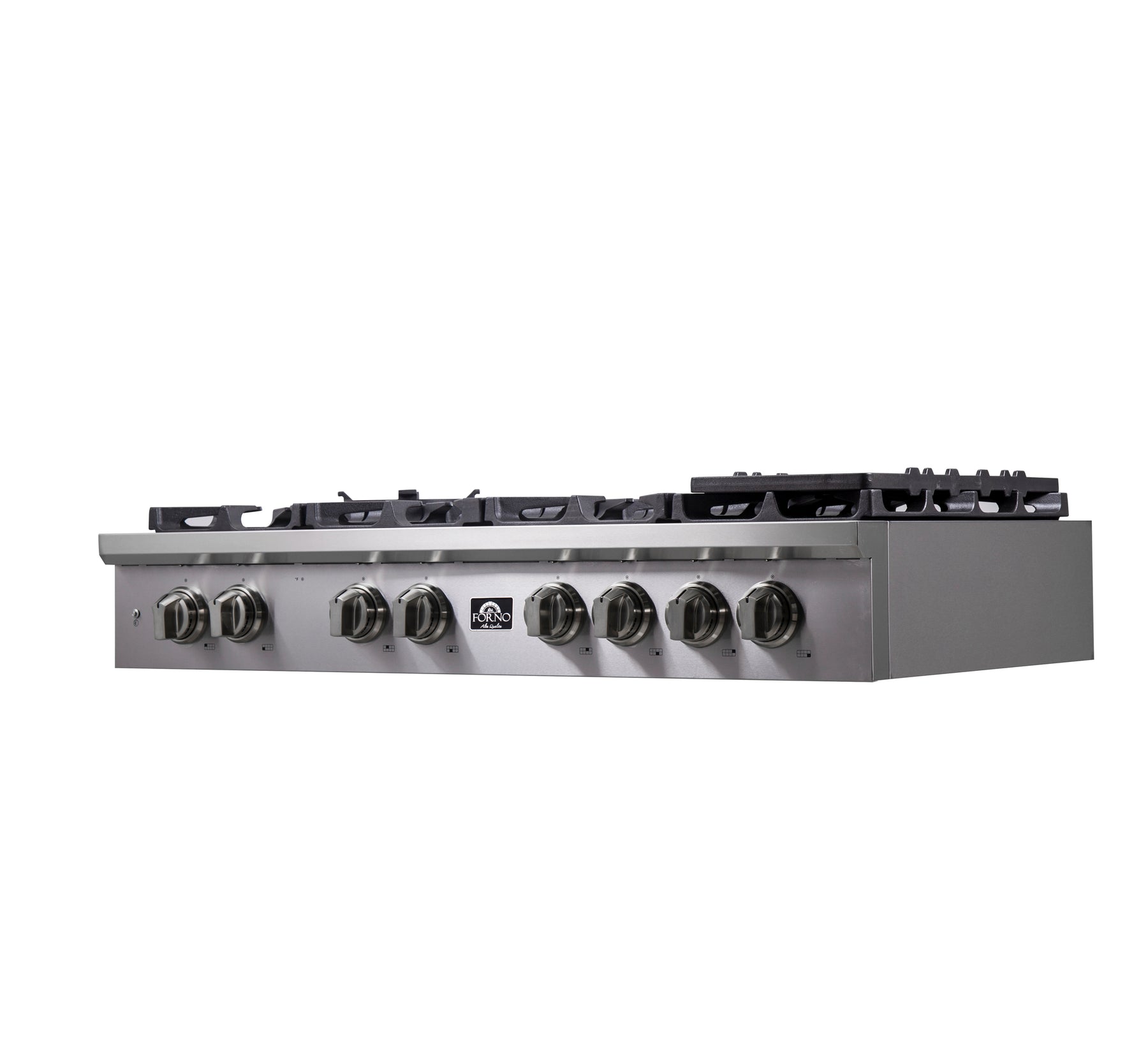 The Forno Spezia 48 Inch gas rangetop features a versatile configuration with 8 sealed dual brass burners totaling 160,000 BTUs, ready for any culinary challenge. Continuous cast iron grates simplify pan movement, while illuminated zinc control knobs offer precise gas cooking control. Includes auto-ignition, griddle, wok-ring, and LP conversion kit. Crafted from heavy-duty 304 stainless steel for easy cleaning, complementing any kitchen design alongside other Forno appliances.