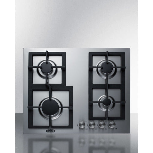 Summit’s 'Made in Italy' LP gas cooktops offer a powerful performance in a durable, safe, and stylish design. The GCJ4SSLP is a four-burner gas cooktop with a 304 grade stainless steel surface for added durability. In a space-saving size of 24 inches, it is perfect for smaller kitchens, apartments, and similar space-challenged environments. Two continuous cast iron grates in an off-center design afford extra space when cooking with multiple pots and pans that can otherwise collide on tighter surfaces. Heavy duty brass and aluminum knobs are located at the front of the unit for convenient access. The knobs require a gentle push-to-turn motion to ignite, and the thermocouple flame protection ensures the gas turns off if the flame goes out. Featuring four gas burners manufactured by Defendi, this cooktop has a variety of cooking options for unparalleled performance. The top left and right 6000 BTU semi-rapid burners suit most cooking needs. The bottom right 10,000 BTU rapid burner is ideal for boiling water or cooking larger dishes, while the bottom-right 3,400 BTU auxiliary burner works well for precision heating and cooking. The GCJ4SSLP uses electronic spark ignition, with a pre-installed 115V 3-prong cord included. This cooktop is preset for use with propane. We include a conversion kit that allows you to switch the connection from LP to natural gas. The 'Made in Italy' collection has gas cooktop options to fit any cooking need, including one, two, four, and five burner choices. Browse our website to explore the full collection.