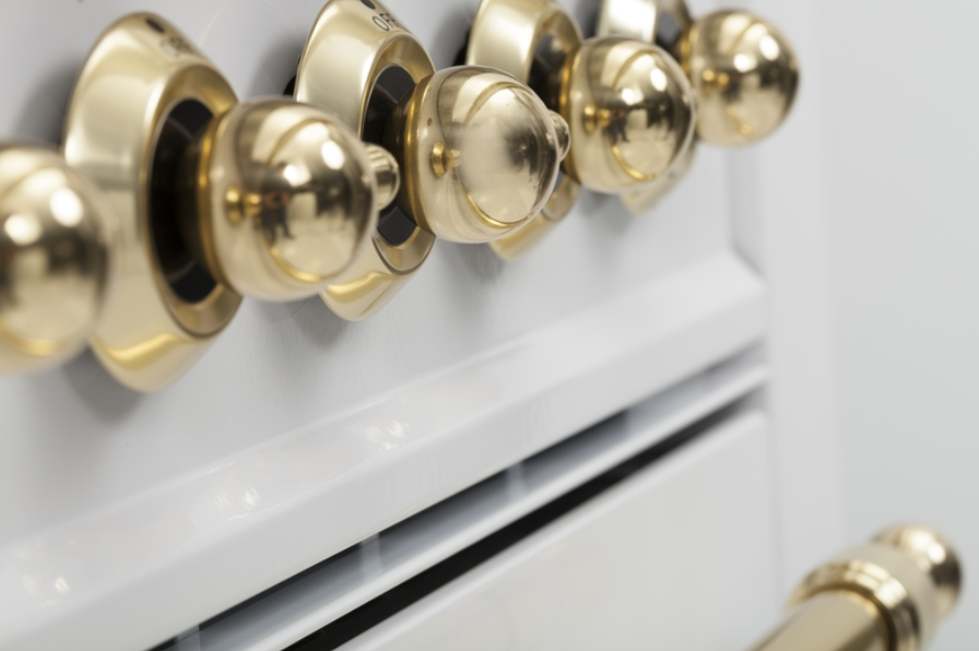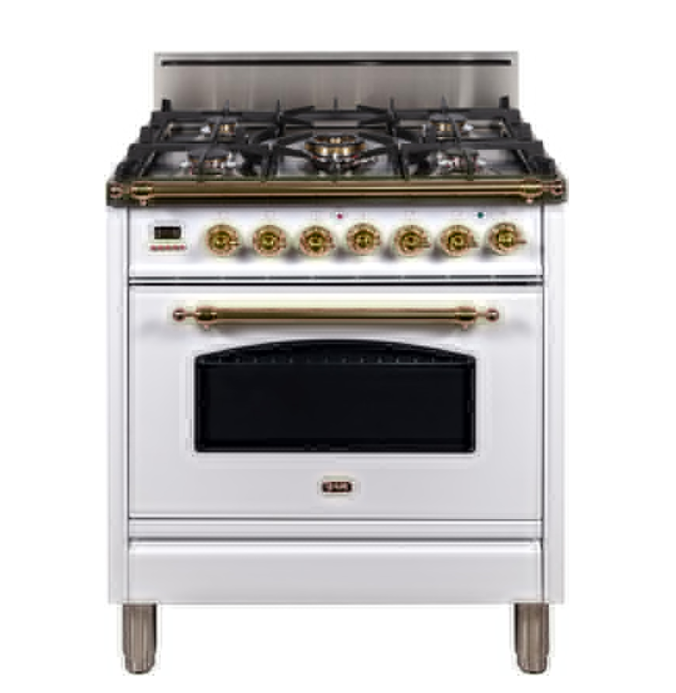 Nostalgie Series 30 Inch Freestanding All Gas Range with Natural Gas, 5 Sealed Brass Burners, 2.7 cu. ft. Total Oven Capacity, Convection Oven, Continuous Grates, Viewing Window, Storage Drawer, True European Convection, Handcrafted from Italy, High-End Workmanship, Dual Function Triple Ring Burner, Gas Conversion Kit Included in White with Brass Trim
