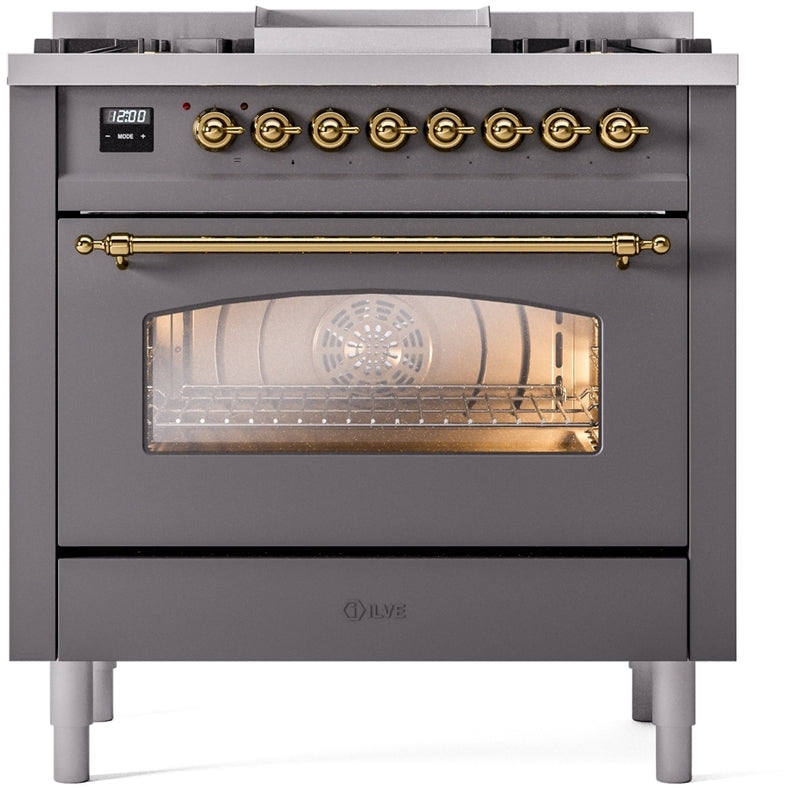 ILVE 36"Dual Fuel Natural Gas Freestanding Range in Matte Graphite with Brass Trim