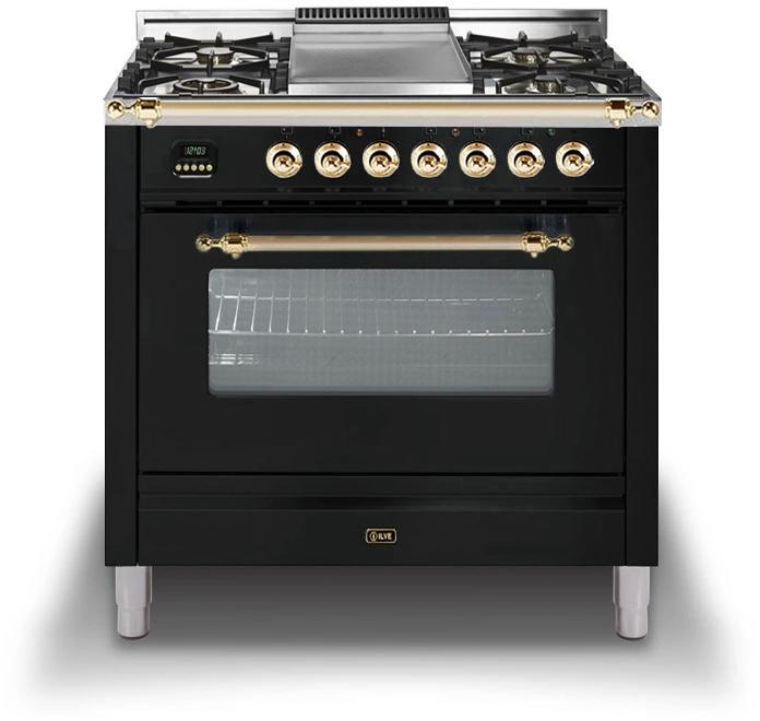 Professional Plus Series 36 Inch Freestanding All Gas Range with Natural Gas, 5 Sealed Brass Burners, Griddle, 3.55 cu. ft. Total Oven Capacity, Convection Oven, Continuous Grates, Viewing Window, Storage Drawer, True European Convection, Handcrafted from Italy, High-End Workmanship, Dual Function Triple Ring Burner, Gas Conversion Kit Included in Glossy Black with Chrome Trim