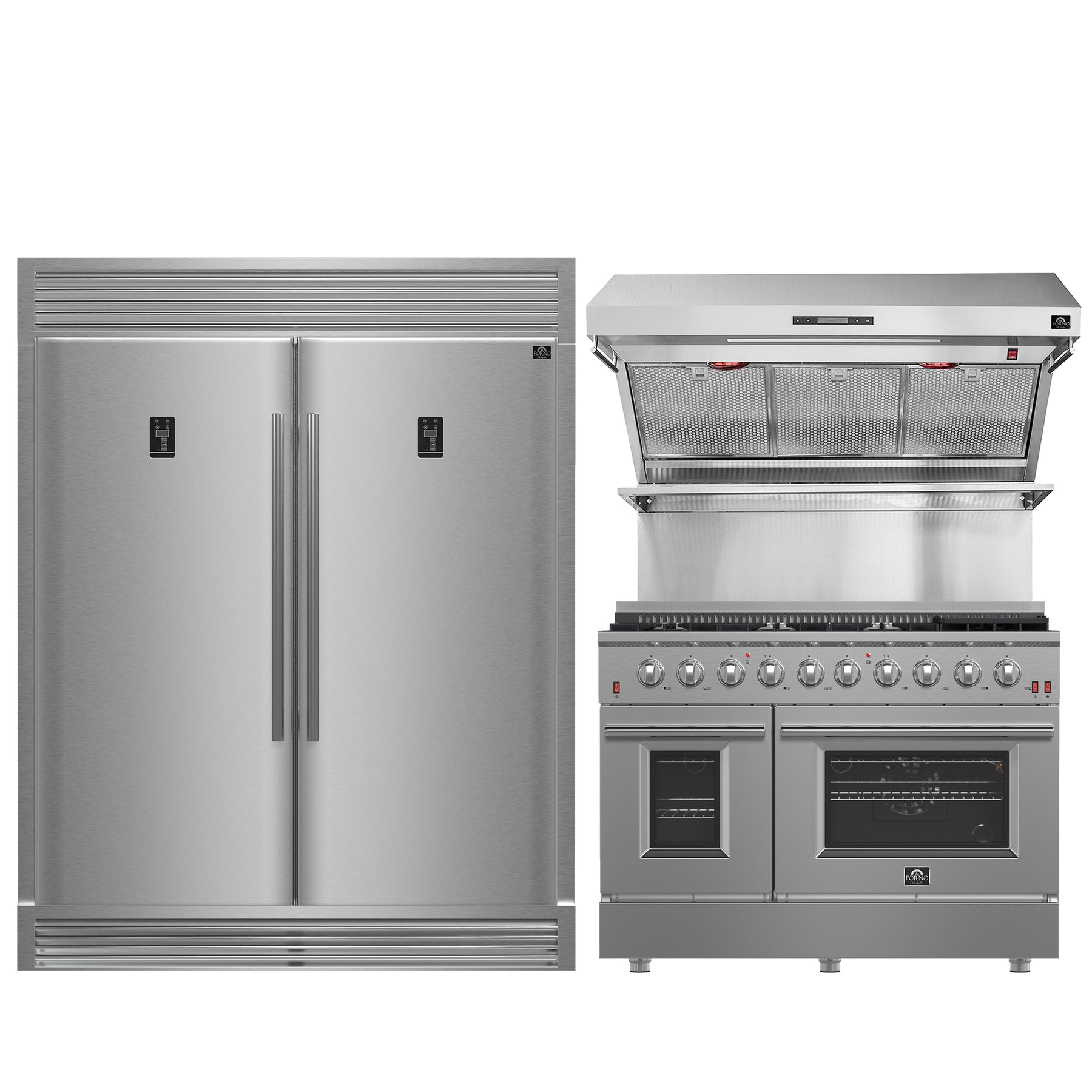 Enhance your kitchen setup with this exclusive bundle, featuring the FORNO Galiano 48" Freestanding Gas Range, renowned for its robust performance and advanced cooking capabilities. Complementing it is the FORNO Rizzuto 60" W. Dual Combo Convertible Refrigerator, known for its expansive storage and cutting-edge cooling technology, alongside the FORNO 48" Wall Mount Range Hood, which ensures efficient ventilation with a modern, sleek design. This trio combines style, functionality, and high-end performance to elevate your cooking experience.