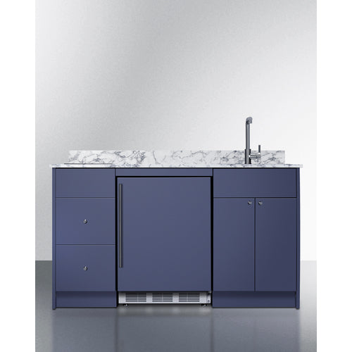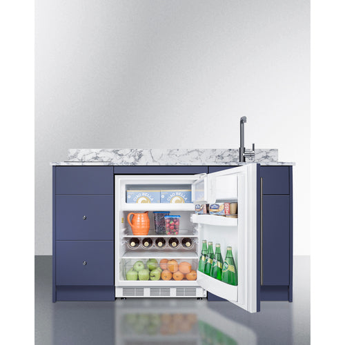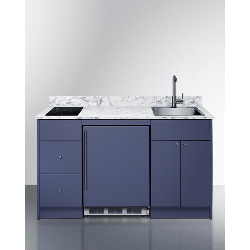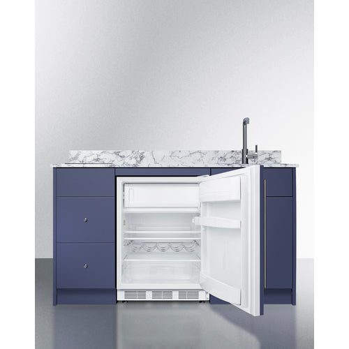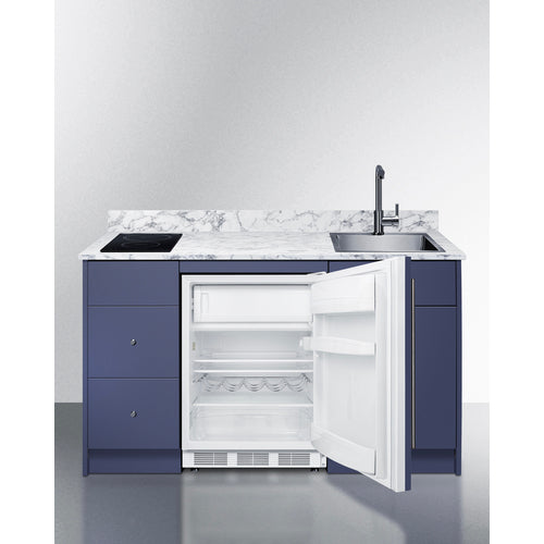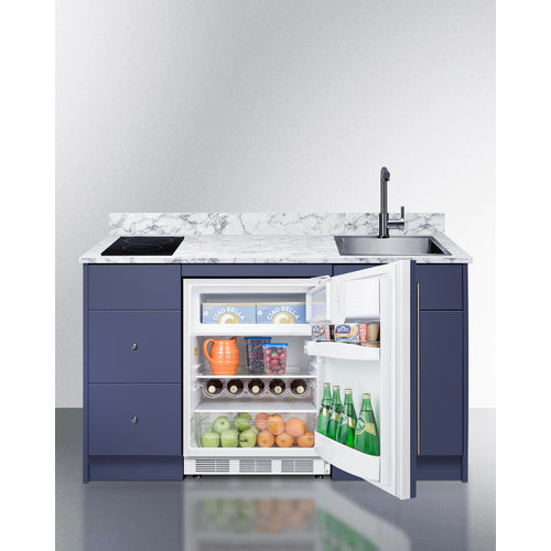 Summit's Turnkey Kitchens & Bars feature pre-installed cabinetry and matching appliances to bring effortless style & instant living to home bars, ADUs, tiny houses, rental properties, office break rooms, and hospitality settings. The Caldera is a 63" wide kitchenette in a midnight navy finish. It features hardwood construction and a countertop made from a water-resistant laminate material with a marble look, with a pre-installed 2-burner induction cooktop included. We include a stainless steel sink with faucet and 5 cu.ft. refrigerator-freezer for food storage. For dry storage, this model has a two-door cabinet and two soft-close drawers. We also supply the door knobs in an attractive brushed nickel finish. The cabinetry comes in a modern slab style. For this unit with the sink located on the left side, see model CALDERAMN35ISINKL. Model CALDERAMN35I includes Summit's CT661WIF, a 24" wide ENERGY STAR certified refrigerator-freezer that utilizes automatic defrost operation in the fresh food section and manual defrost operation in the freezer to ensure items stay frozen. Inside, the CT661WIF includes adjustable glass shelves for spill-proof storage and easier cleaning, as well as a scalloped wine shelf to hold wine and champagne bottles safely in place. Door racks offer additional convenience for tall bottles and condiments and a clear crisper drawer ensures your produce is kept under the ideal conditions. This model includes automatic interior lighting and an adjustable dial thermostat. The door comes with a pre-installed stainless steel handle and wood panel to seamlessly blend into the cabinet. This kitchenette also features Summit's SINC2B115, an ENERGY STAR certified 12" wide 2-zone induction cooktop. The pre-installed cord includes a 3-prong NEMA 5-15P plug for fast setup. The surface is made of jet black glass for a contemporary look that's easier to clean. The rear 1800W element is sized at 8 1/4", while the front element is 1/4" wide and 1300W . POWER NOTE: Due to the 115V operation, a power management function limits the overall output to 1800W. The CALDERAMN35I is shipped in two boxes on one pallet. Setup involves unpacking the unit and setting into place. A professional can install the sink and connect your plumbing. Then slide the refrigerator into the cabinetry, plug into a standard 115V outlet, plug the cooktop into a separate outlet, and enjoy your new kitchen. We recommend your installation team watches the unboxing video before setup (summitappliance.com/turnkey-installation). Overall shipping dimensions are 73" H x 77" W x 31" D. Cabinetry's packaged dimensions (with refrigerator removed) is 40" H x 67.5" W x 29.5" D. Unpackaged, the final product dimensions are 35.75" H x 62.5" W x 25.5" D. With its classic design, standard height, and easy plug-and-play setup, the CALDERAMN35I is the perfect solution to complete any home bar or hospitality space. For this unit in a classic white finish, see model CALDERAWH35I. For this unit in an ADA-compliant height, see model CALDERAMN33I. Summitās Turnkey collection also features fully assembled dry bars and wet bars designed for easy and elegant beverage service. Explore the entire Turnkey Kitchens & Bars collection at summitappliance.com