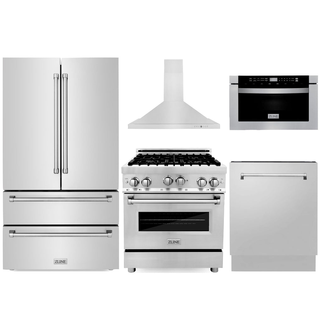 ZLINE 5-Piece Appliance Package - 30" Gas Range, 36" Refrigerator, Convertible Wall Mount Hood, Microwave Drawer, and 3-Rack Dishwasher in Stainless Steel