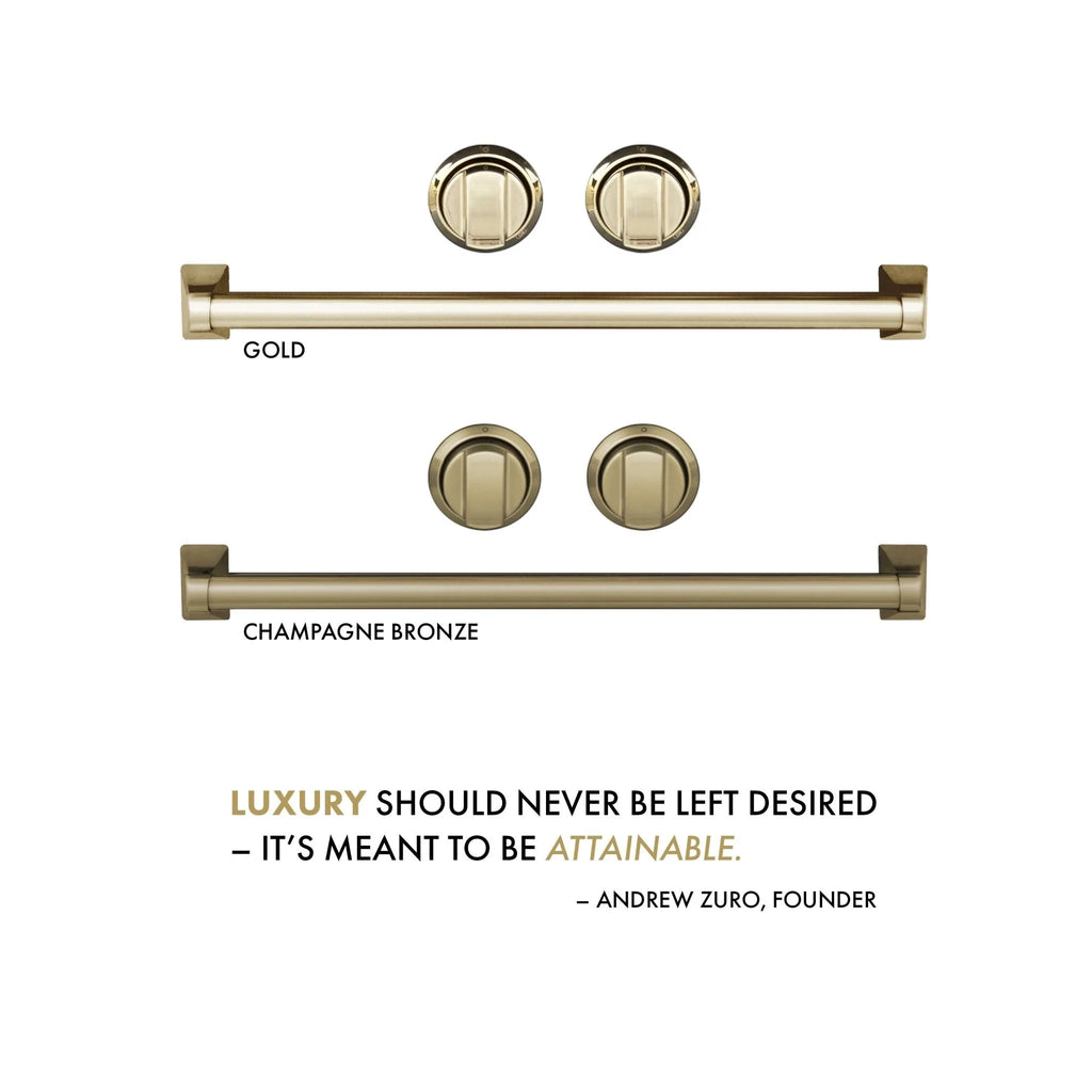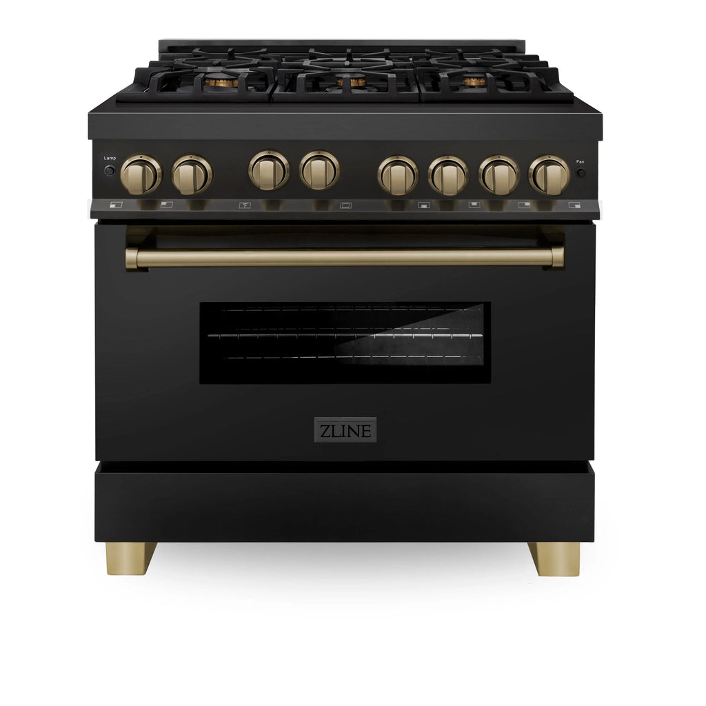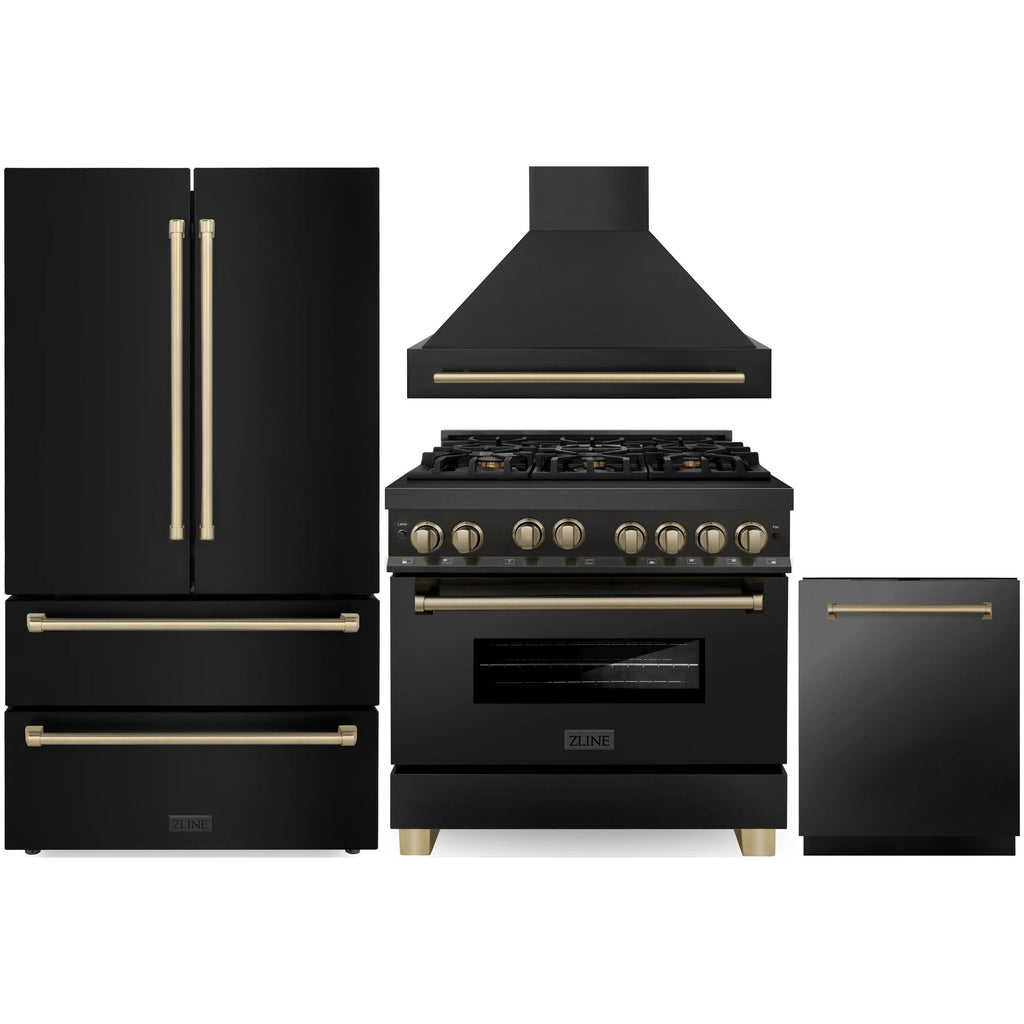 ZLINE Autograph Edition 4-Piece Appliance Package - 36" Gas Range, 36" Refrigerator, Wall Mounted Range Hood, & 24" Tall Tub Dishwasher in Black Stainless Steel with Champagne Bronze Trim (4AKPR-RGBRHDWV36-CB)