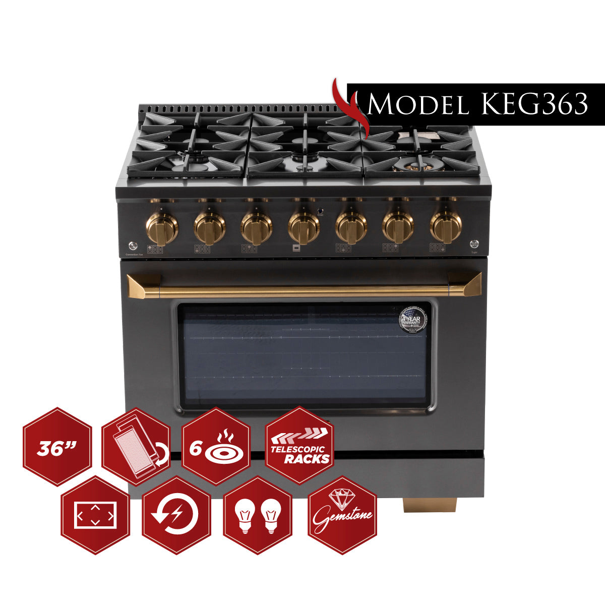 This premium gas range features powerful burners, each manually controlled by gold knobs, allowing you to cook with precision. The heavy-duty cast iron grates provide a sturdy and stable surface for all your pots and pans, while the spacious oven offers plenty of room for baking, and roasting your favorite dishes. The shorter kickplate design unveils a fancy set of squared gold legs, matching the knobs and the handle.