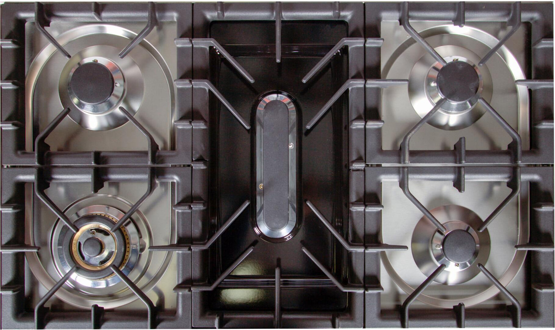 Eliminated eventual flame extinctions due to drought or liquid overflow. Burner sizes Include 1 triple ring burner, 2 big burners, and 2 small burners. Enameled removable burner caps and sturdy grates for easy