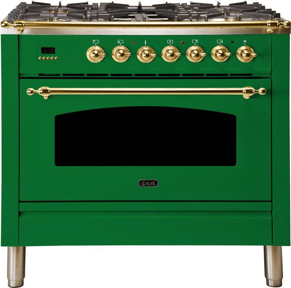 Nostalgie Series 36 Inch Freestanding Dual Fuel Range with Natural Gas, 5 Sealed Brass Burners, 3.55 cu. ft. Total Oven Capacity, Griddle, Convection Oven, Continuous Grates, Viewing Window, Storage Drawer, True European Convection, Handcrafted from Italy, High-End Workmanship, Dual Function Triple Ring Burner, Oven: Defrost Function, 220 Volts, Gas Conversion Kit Included in Emerald Green with Brass Trim