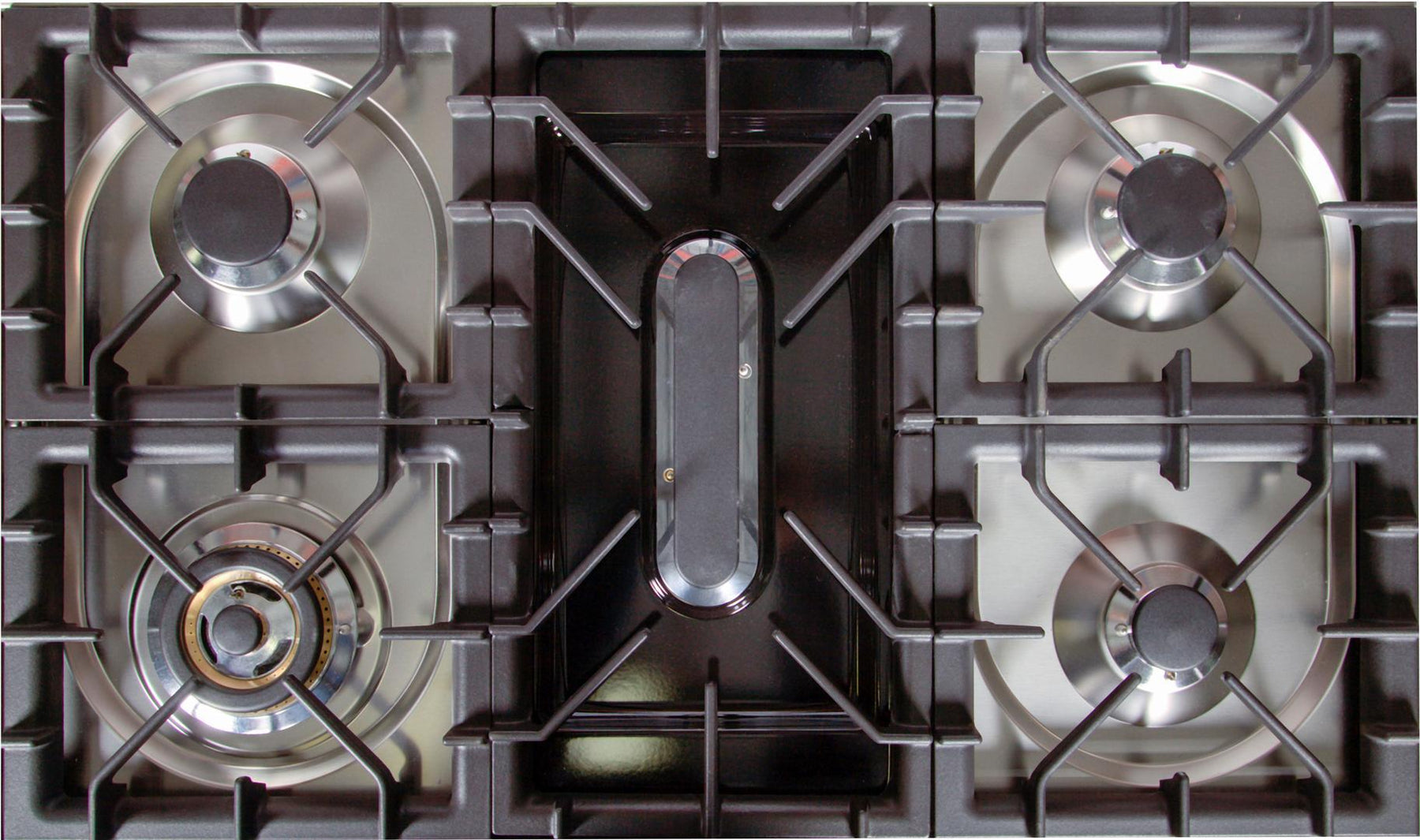 Robust Cast Iron GratesThe heavy duty grates form a continuous leveled surface over your cooktop for more stable cooking environment, allowing you to move pots and pans from burner to burner without having to lift them.