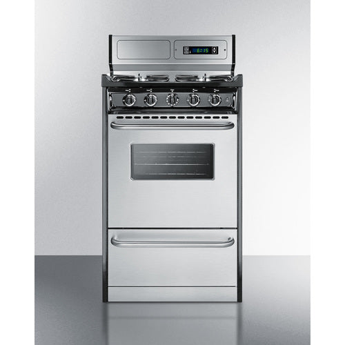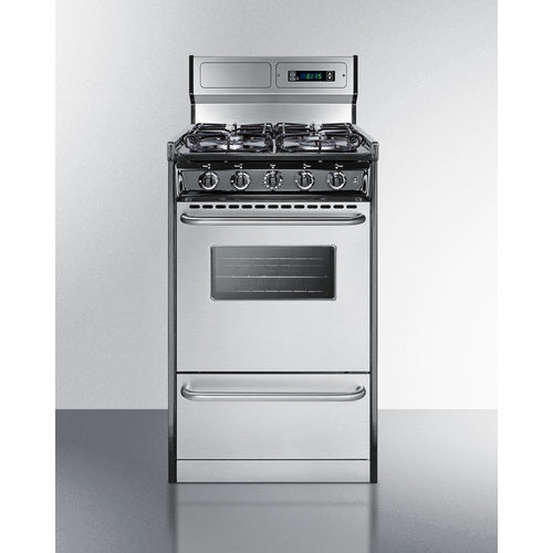 Summit Appliance offers a wide selection of American-made household ranges built for long-lasting durability in space-challenged kitchens. The TTM1307BKSW is 20" wide apartment-sized gas range with a generous 2.46 cu.ft porcelain oven interior that can fit large trays. Two adjustable oven racks are included. An oven window and on/off interior light allow you to easily keep watch over your cooking. The broiler is located below the oven in a drop-down compartment. Four sealed 9100 BTU gas burners accommodate most of your stovetop heating needs, with upfront push-to-turn knobs that let you adjust your cooking without reaching over hot burners. This unit utilizes an electronic ignition system for added safety. Stainless steel doors feature professional style towel bar handles, bringing classic elegance to smaller kitchen spaces. The deluxe 8" high backguard includes a digital clock and timer for added convenience when cooking. This unit has a recessed oven door and is conveniently sized at just 24" deep for a better fit in galley in L-shaped kitchens, where every inch counts. With its classic style and quality construction, Summit's made in the USA cooking line offers reliable cooking for smaller homes. Additional choices are available in 24", 30", and 36" wide fits. This unit ships ready for natural gas connections. To use with propane, add the Kit LP S2.