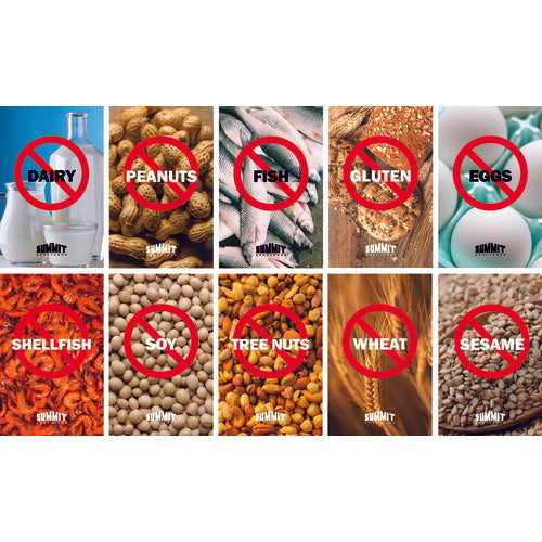 Ships with a pack of 10 allergy-specific magnets to denote which foods can and cannot be stored in the “allergy-free refrigeration zone.” They include: “NO PEANUTS,” “NO TREE NUTS,” “NO SHELLFISH,” “NO WHEAT,” “NO FISH,” “NO SOY,” “NO DAIRY,” “NO EGGS, ” "NO SESAME," and “NO GLUTEN’
