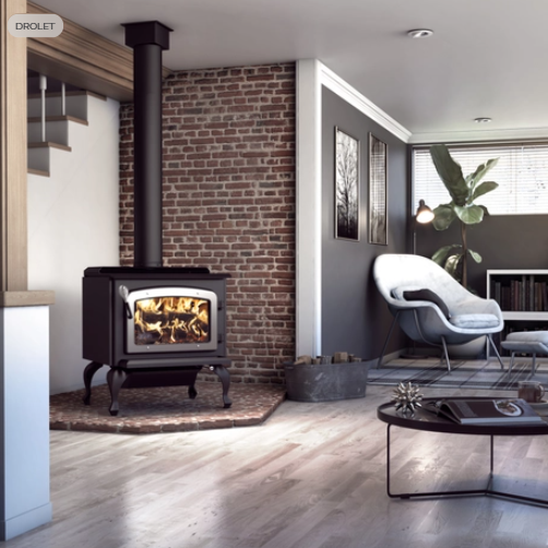 Ideal for spaces up to 2,100 ft², this large non-catalytic wood stove produces up to 75,000 BTU/h and emits only 2.3 g/h of fine particles. The unit is equipped with side panels that reduce clearances to combustible materials, and a top heat exchanger that redirects heat to the front of the unit.