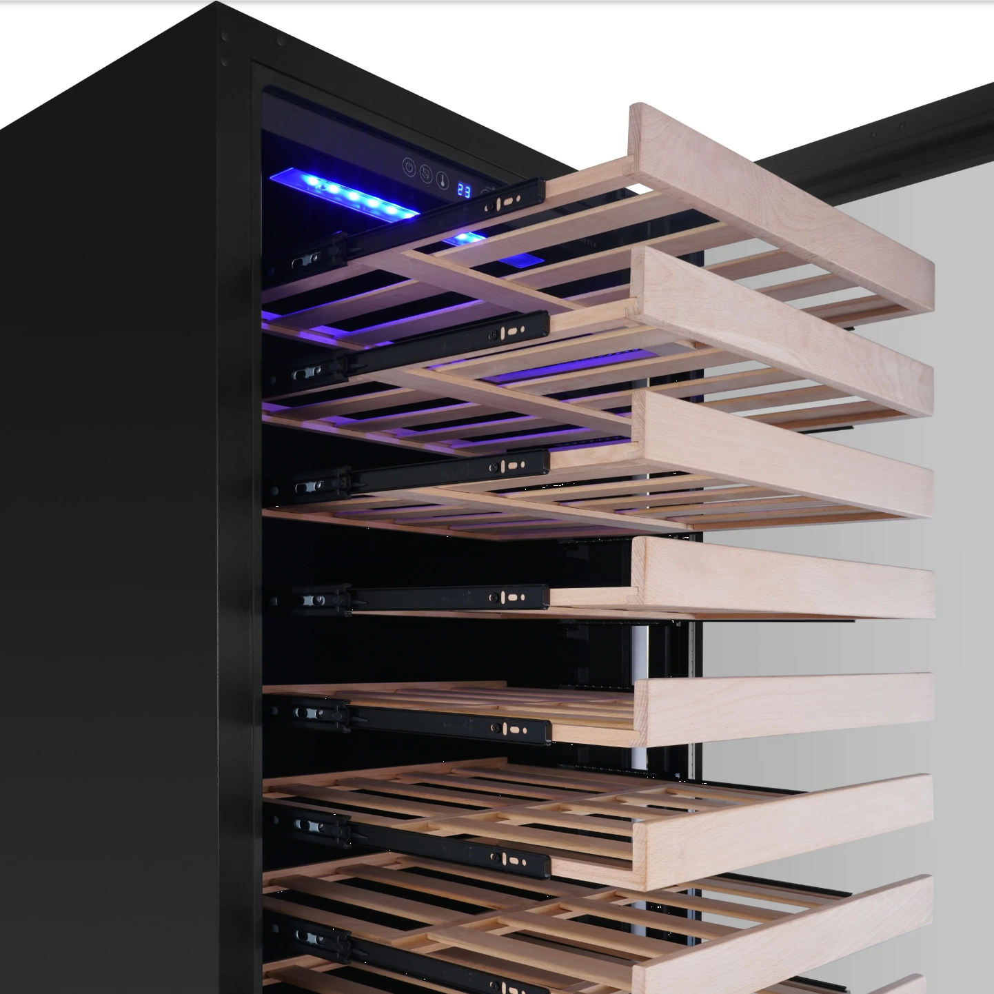Optimized FULL-EXTENSION pull-out wood shelves with sturdy and wine-friendly beech; Cleverly spaced to fit both regular and larger bottles up to 3.39" (86mm) in diameter.