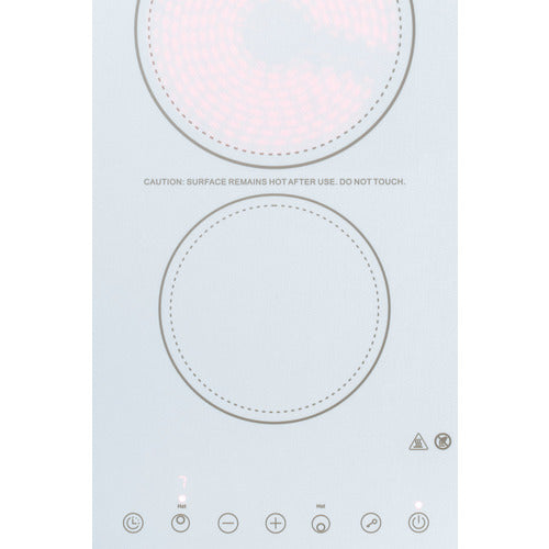 SUMMIT's collection of smooth-top radiant cooktops offers an easy-to-clean design with modern style built for smaller kitchen spaces. The CR2B23T4W is an ENERGY STAR certified 12" wide 230V radiant cooktop designed to fit popular 10 3/4" W x 19 7/8" D counter cutouts. The surface is made from smooth Schott ceramic glass in a classic white finish for a durable, modern look. This unit does not ship with a power cord and must be hard-wired by a professional. For true cooking versatility, the CR2B23T4W features a large 7" 1800W burner in the rear and a smaller 5 1/2" 1200W burner in front. The digital touch controls are located in the front for easier accessibility, preventing users from reaching over hot burners to make adjustments. Nine power levels provide true cooking versatility, allowing you more precision in melting or simmering at a low wattage and the convenience of boiling water quickly at a higher setting. The digital display makes it easy to read and manage the settings at the touch of a button. This unit also includes a timer function that lets you program a power level and cook time (up to 99 minutes). The burner turns off automatically when the cooking duration has finished. Safety features include a child lock function, automatic shutoff, and residual heat indicators for both elements. With its attractive design, ideal size, and intuitive touch controls, the CR2B23T4W brings a user-friendly cooking performance with reliable safety to small kitchen spaces.