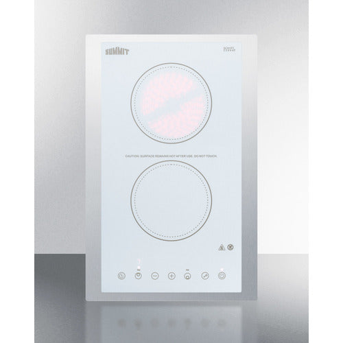 SUMMIT's collection of smooth-top radiant cooktops offers an easy-to-clean design with modern style built for smaller kitchen spaces. The CR2B15T2WTK15 is an ENERGY STAR certified 12" wide 115V radiant cooktop designed to fit popular 10 3/4" W x 19 7/8" D counter cutouts. The surface is made from smooth Schott ceramic glass in a classic white finish for a durable, modern look. This unit does not include a power cord and must be hard-wired by a professional. It ships with a stainless steel trim kit that allows the cooktop to be installed in 15" wide counter cutouts. Two 5 1/2" burners each feature 1200W operation to cover most cooking needs. The digital touch controls are located in the front for easier accessibility, preventing users from reaching over hot burners to make adjustments. Nine power levels provide true cooking versatility, with a digital display that makes it easy to read and manage the settings at the touch of a button. This unit also includes a timer function that lets you program a power level and cook time (up to 99 minutes). The burner turns off automatically when the cooking duration has finished. Safety features include a child lock function, automatic shutoff, and residual heat indicators for both elements. With its attractive design, ideal size, and intuitive touch controls, the CR2B15T2WTK15 brings a user-friendly cooking performance with reliable safety to small kitchen spaces.