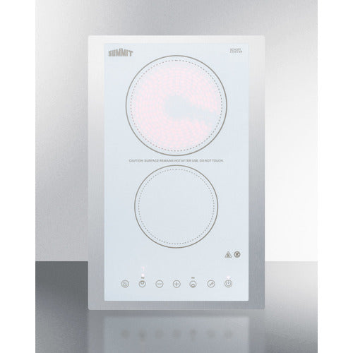 SUMMIT's collection of smooth-top radiant cooktops offers an easy-to-clean design with modern style built for smaller kitchen spaces. The CR2B23T4WTK15 is an ENERGY STAR certified 12" wide 230V radiant cooktop designed to fit popular 10 3/4" W x 19 7/8" D counter cutouts. The surface is made from smooth Schott ceramic glass in a classic white finish for a durable, modern look. This unit does not include a power cord and must be hard-wired by a professional. It ships with a stainless steel trim kit that allows the cooktop to be installed in 15" wide counter cutouts. For true cooking versatility, the CR2B23T4W features a large 7" 1800W burner in the rear and a smaller 5 1/2" 1200W burner in front. The digital touch controls are located in the front for easier accessibility, preventing users from reaching over hot burners to make adjustments. Nine power levels provide true cooking versatility, allowing you more precision in melting or simmering at a low wattage and the convenience of boiling water quickly at a higher setting. The digital display makes it easy to read and manage the settings at the touch of a button. This unit also includes a timer function that lets you program a power level and cook time (up to 99 minutes). The burner turns off automatically when the cooking duration has finished. Safety features include a child lock function, automatic shutoff, and residual heat indicators for both elements. With its attractive design, ideal size, and intuitive touch controls, the CR2B23T4WTK15 brings a user-friendly cooking performance with reliable safety to small kitchen spaces.