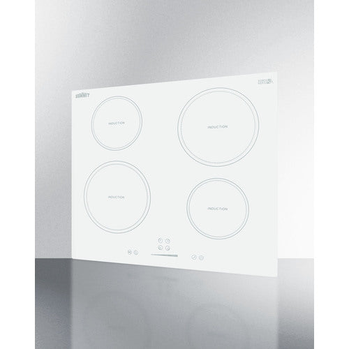 Enjoy the ease, speed, and safety of induction cooking with Summit's selection of energy efficient induction cooktops. The SINC4B242W is a 4-zone induction cooktop designed for use with 208-240V power sources. It comes in a popular size ideal for smaller kitchen spaces, including hotel suites and studio apartments. It is designed for installation in common cutouts sized at 21 7/8" W x 19 5/8" D. This unit requires professional installation (cord not included). Smooth white glass made by EuroKera creates an attractive, easy-to-clean surface. The front left and rear right elements are sized at 8 1/4" and operate at 2000W, ideal for boiling large pots of water or cooking with woks and other large cookware. The rear left and front right 1500W elements are sized at 6 1/4". The smart burner layout helps provide plenty of room so that larger cooking vessels are spaced apart, making it easier to use all four elements without cookware colliding. Centered upfront for convenient use, the touch controls allow intuitive operation, with a slider control panel that makes it easy to adjust your heat. The digital display shows which elements are in use and their power setting. Audible beeps sound when the touch controls are activated. This cooktop is equipped with a child lock that allows you to disable the controls to prevent unintended heating. A "stop & go" function allows you to immediately turn both zones off if needed, with the last settings resuming when reactivated. This unit also includes a timer function that lets you program a power level and cook time (up to 99 minutes) that can either turn the unit off when complete, or serve as a visual countdown with an audible alert when the set time has been reached. Safety features include automatic shutdown, overheat protection, and overflow protection, which will temporarily disable the power if boiling liquid touches the control panel. With its ideal size and advanced safety features, the SINC4B242W is the perfect cooktop to ensure intuitive, safe cooking in a variety of small kitchen settings. For this unit in a black finish, see the SINC4B241B. Additional choices are available in smaller and larger sizes, as well as radiant and coil styles. Browse the full Summit line for more options. NOTE: Induction cooling utilizes magnetized energy that starts inside the cookware, meaning the temperature of the actual cooktop surface does not get nearly as hot as traditional gas or electric elements. Most of the heat is retained inside your cookware, making induction technology the most efficient heating method for your kitchen. Because induction cooking requires magnetic energy, your cookware must be made of cast iron, steel, or magnetic stainless steel. Materials that will not work include aluminum, copper, and non-magnetic stainless steel. Many of your current pots and pans may already be induction-friendly. In order to determine if your cookware will work on an induction surface, simply place a magnet (such as one hanging on your refrigerator) on the bottom of the pan. If the magnet sticks, the pan will cook. Summit also offers an induction cookware set for purchase.