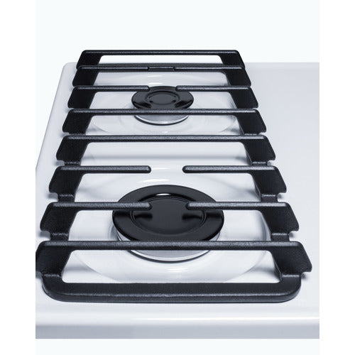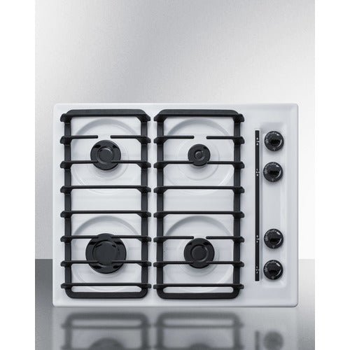 Made in the U.S.A., Summit's gas cooktops offer lasting quality and reliable cooking for smaller kitchen spaces. The WTL033S is a 24" wide 4-burner cooktop designed for 22 5/8" W x 18 5/8" D cutouts. The scratch-resistant porcelain surface features a classic white finish and recessed design to better contain spills. The side-located push-to-turn dial knobs offer easy use. Two sets of continuous cast iron grates are designed to hold up to heavy pots and pans. Four sealed Sabaf burners with removable burner caps ensure safer and cleaner cooking. The WTL033S includes a high output 12000 BTU burner for powerful heating, conveniently located in front for easy access. The rear 5000 BTU burner is ideal for simmering at lower power or keeping food warm without overcooking. Two standard 9100 BTU burners meet most cooking needs. This unit utilizes electronic spark ignition and includes a pre-installed 3-pronged cord. The WTL033S is set for natural gas and can be converted to propane connections with the purchase of our Kit LP S2. Additional choices are available in black and chrome.