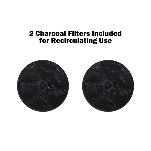 This range hood can be used ducted with a 6" round duct, or for recirculating/ducted operation. We include two charcoal filters for use in kitchens where there is no exhaust connection to the outside. Two aluminum mesh cassette filters offer plenty of ventilation coverage. This model includes a pre-installed 3-prong 115V cord and mounting bracket.