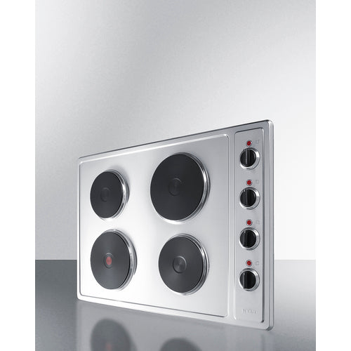 Summit's selection of electric cooktops offers the perfect fit for every application. Sized at 30" wide, the CSD4B300 is a 230V cooktop with four solid disk elements. The surface comes in brushed stainless steel for an attractive look built to last. The element located in the front left side is 8" wide, with 2000W of cooking power ideal for larger cookware. The rear 1500W 8" element also accommodates full-sized pots and pans, while two 1000W 6" heating elements meet most general heating needs. The solid disk elements are constructed from cast iron, ensuring extreme durability. These elements also retain heat longer than traditional coil or glass top surfaces, making them ideal for keeping the contents in your pots and pans warmer before serving. Even heat distribution helps to improve your cooking results. This unit includes push-to-turn knobs and an "on" indicator light for each burner for added safety. With its modern style and durable design, the CSD4B300 is a great choice for hotels, mobile homes, tiny houses, and other small kitchens with specific cooking needs. This is a 230V cooktop that requires professional installation. Additional sizes are available in solid disk, as well as traditional radiant, coil, induction, and gas. Browse the full Summit product line to explore your options.