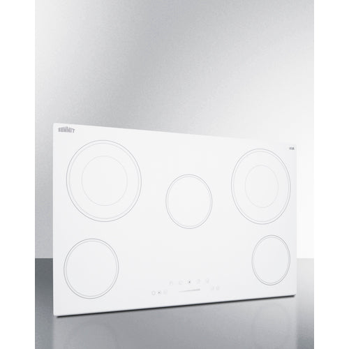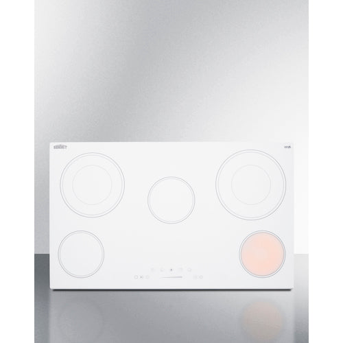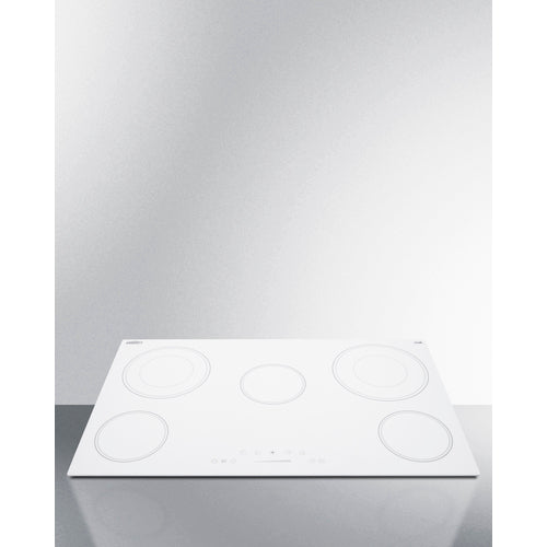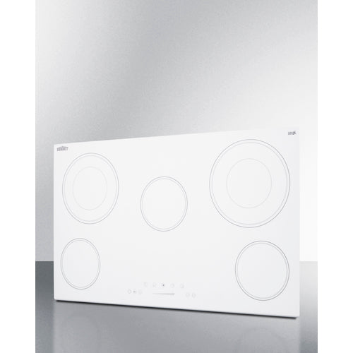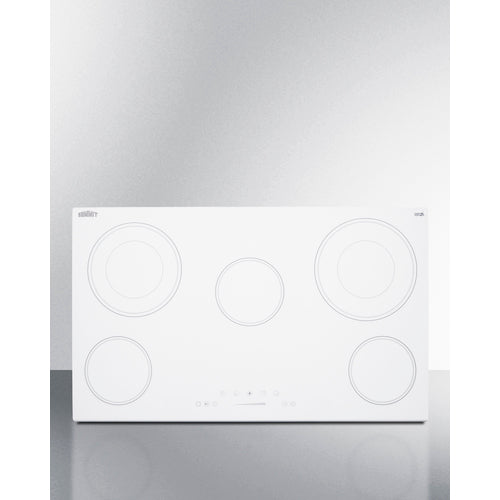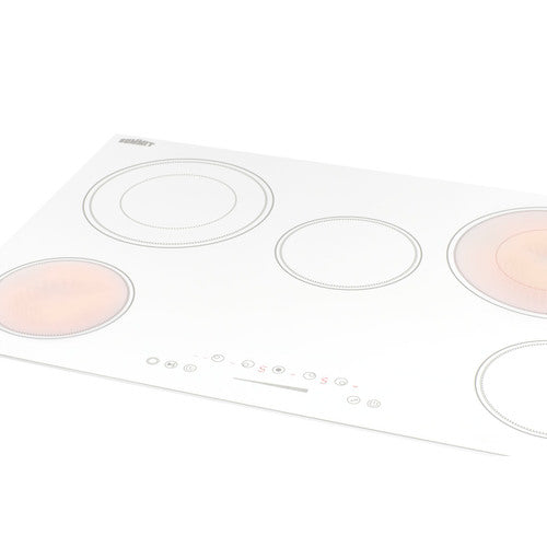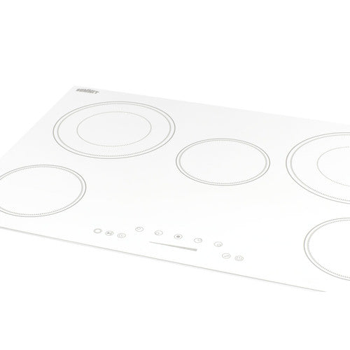 Summit's collection of smooth-top radiant cooktops includes fully featured models sized for standard kitchen counters, with user-friendly touch controls. The CR5B36TXW is a 36" wide 208-240V radiant cooktop designed to fit popular 34 3/4" W x 19 5/8" D counter cutouts. The surface is made from smooth EuroKera ceramic glass in a classic white finish for a durable, modern look. This unit does not ship with a power cord and must be hard-wired by a professional. Five elements let you meet a variety of cooking needs. The two extra large dual ring elements in the rear (2200W 9" element on the left and 3000W 9 3/4" element on the right) allow you to efficiently heat woks, Dutch ovens, and other large cooking vessels or to switch to the inner 5 1/2" elements as needed. The 6 1/2" 1200W front burners cover standard sizes, while the center 100W warming zone element lets you keep cookware heated without overcooking. The digital controls are centered upfront, ensuring users won't have to reach over hot burners to adjust the temperature. The intuitive touch design is easy to operate and clean. This unit also includes a timer function that lets you program a power level and cook time (up to 99 minutes) that can either turn the unit off when complete, or serve as a visual countdown with an audible alert when the set time has been reached. Safety features include a child lock function, automatic shutoff after two hours, and a residual heat indicator. With its attractive design, smartly designed burner configuration, and intuitive touch controls, the CR5B36TXW brings a user-friendly cooking performance with reliable safety to the kitchen. Additional choices are available in 24" and 30" wide sizes, as well as black glass finishes. Browse the full Summit lineup for more.